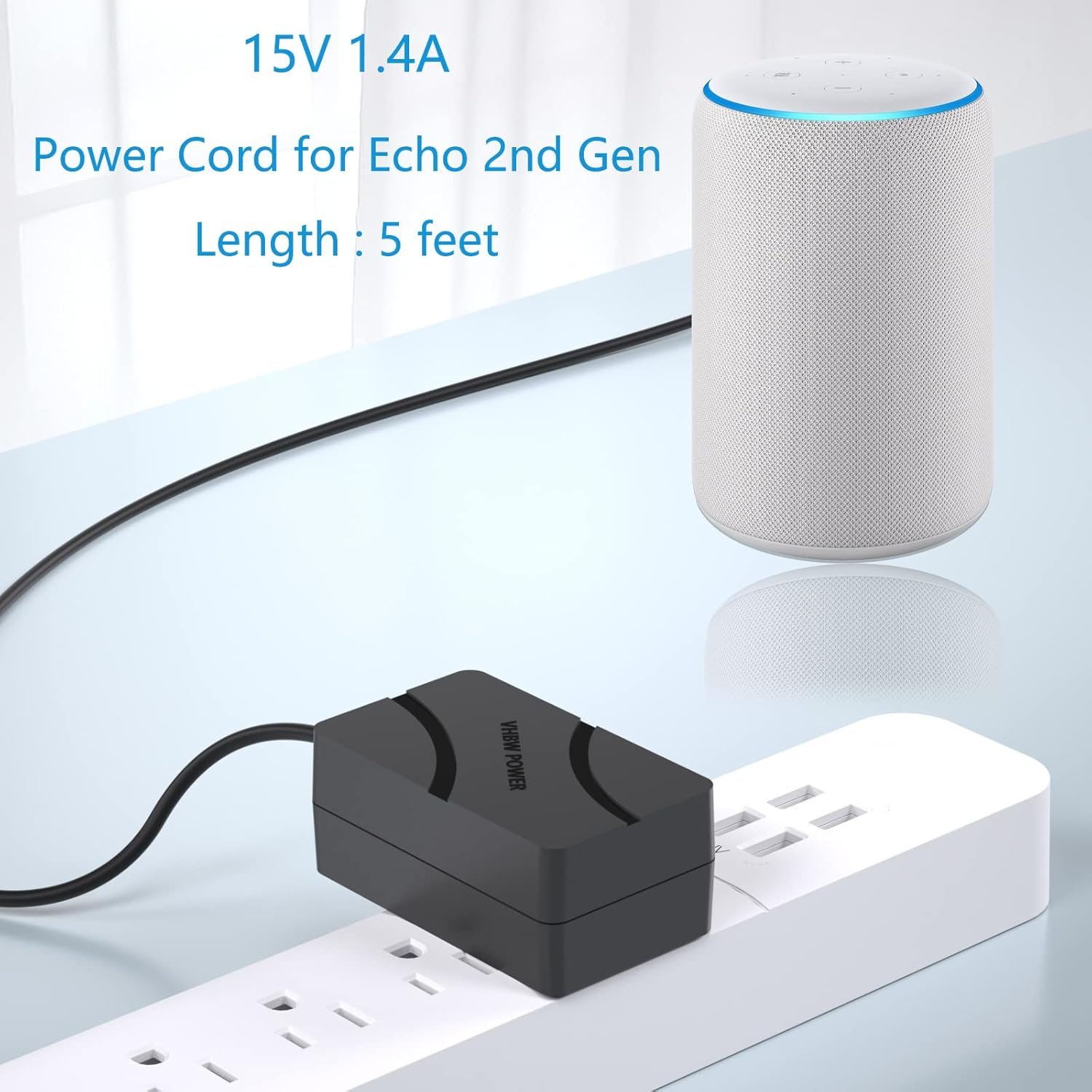 Replacement for Echo Power Cord Specification: worldwide input voltage range: 100-240V 50/60HZ; Output: 15V 1.4A, Power 21W Max. The power cord has a total length of 5 feet, enough for indoor use. Strain-eliminated tail cards for greater usability and resistance to flexing.