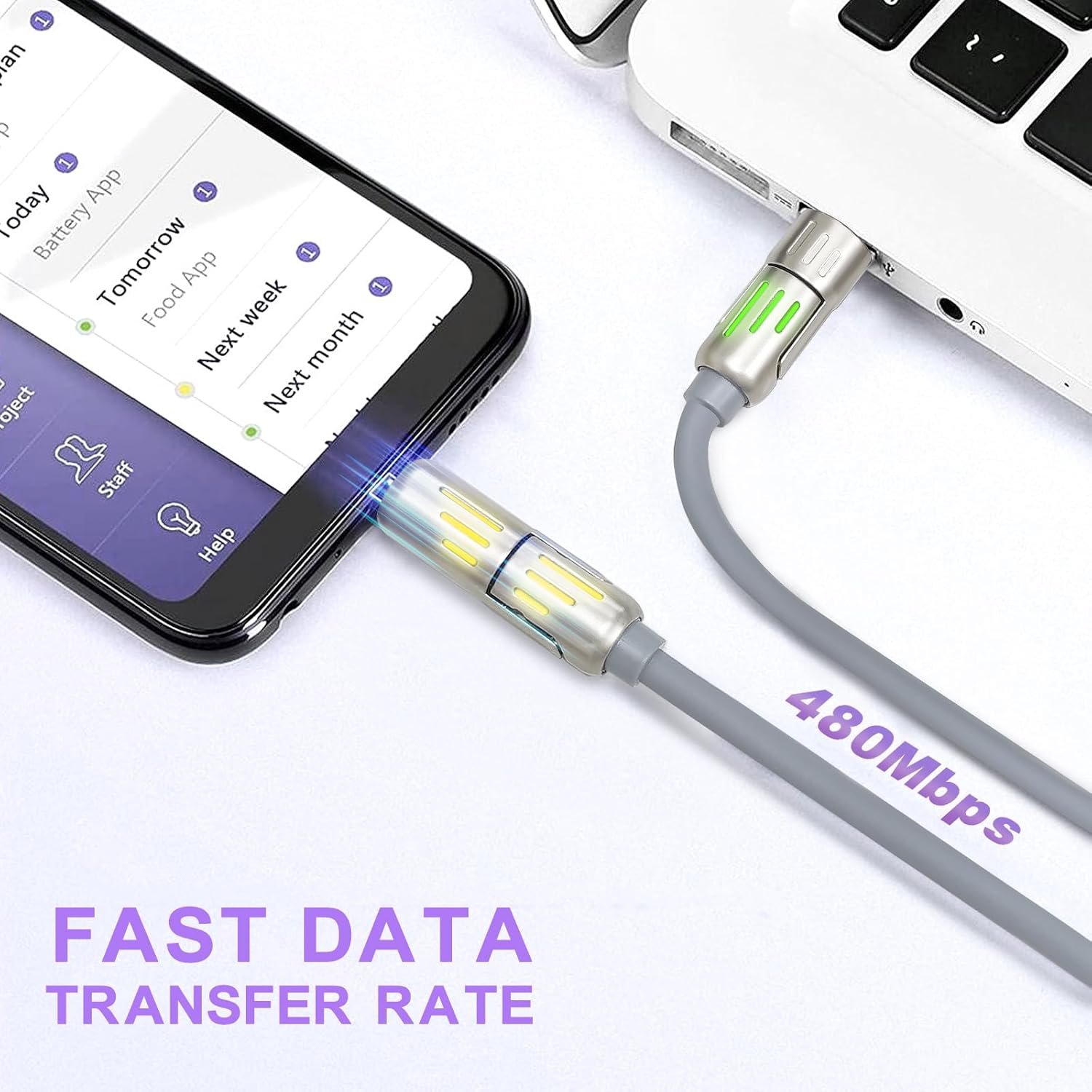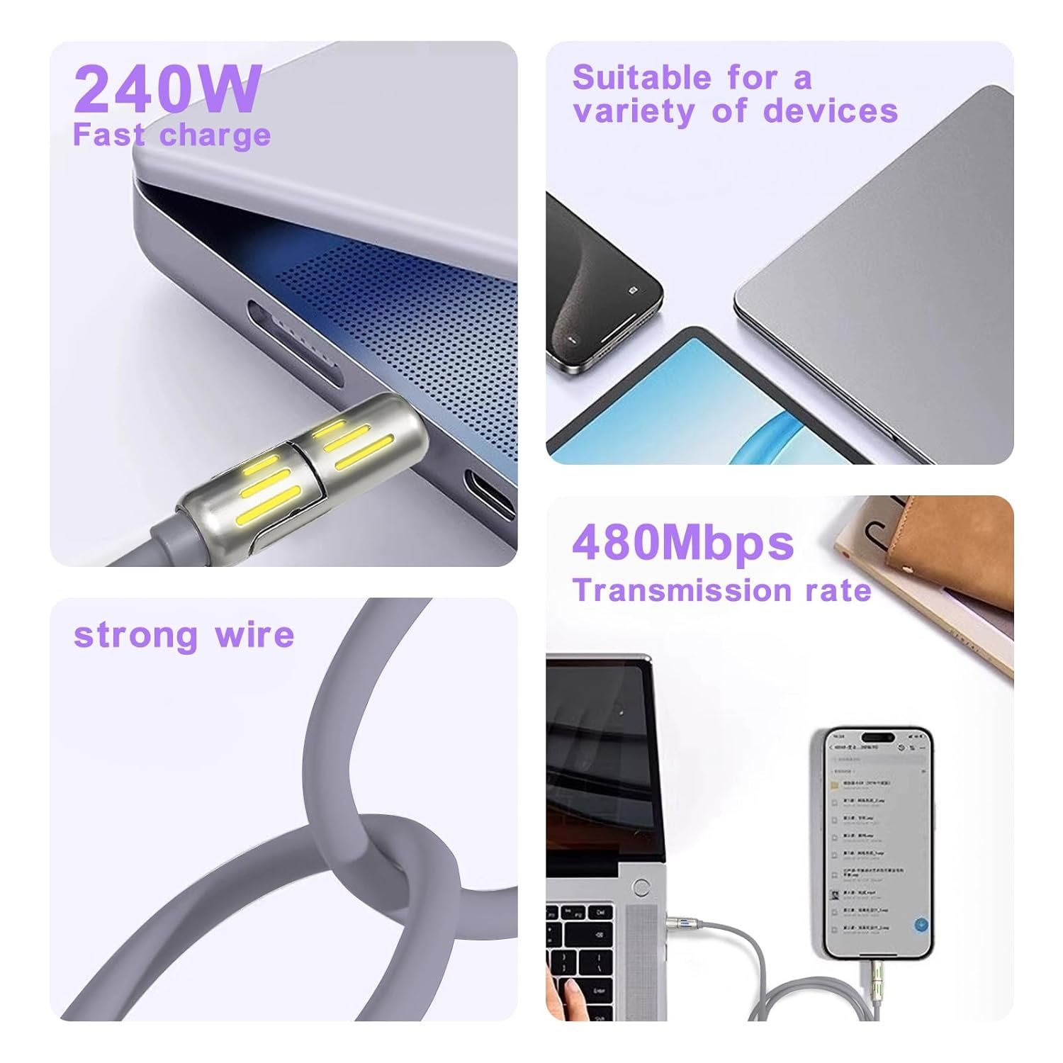 [240W Fast Charging & Data Transfer] This charger cord provides up to 65W Output. The phone can be charged up to 65% in 30 minutes. In addition, 4 in 1 charging cable also supports data transfer, 1G file transfer takes only 19 seconds
