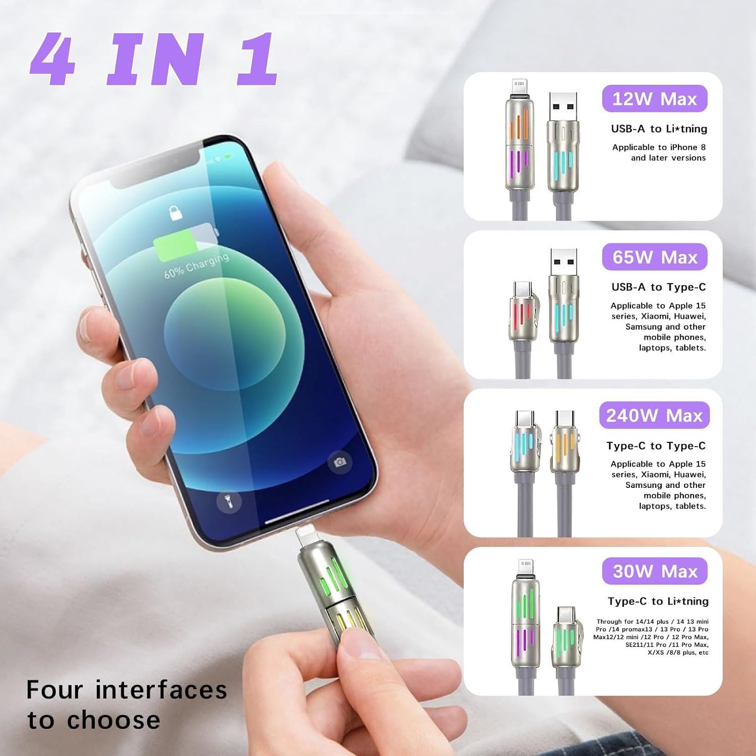[4-in-1 Versatile Cable] Fast Charging Cable is designed to simplify your life. It has four ports, combines – USB C to USB C, USB C to L, USB A to L, and USB A to C – in one cable. One cable meeds all your charging needs