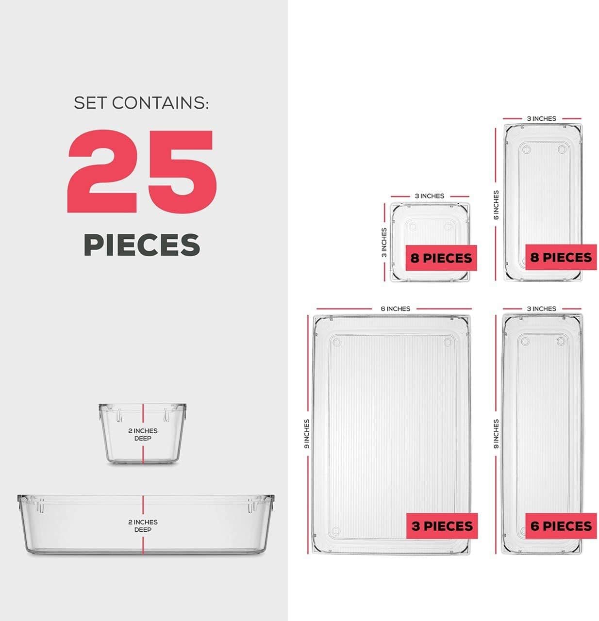 Keep your Desks, Drawers, Dressers or Vanity neatly organized with these Multipurpose Clear Plastic organizer storage Trays. Practical design to help maximize your space. Use them side by side to keep items organized and easy to find. Ideal for kitchen drawers, vanity drawers, desk drawers, dresser drawers, pantry drawers. Great for closets, bedrooms, bathrooms, laundry rooms, craft rooms, mudrooms, offices, play rooms, garages, or any room of your home / apartment / condo / dorm room / RV or camper Great for storing organizing cosmetics, makeup tools, hair accessories, jewelry, office supplies, craft supplies, utensils, etc. Made of durable high quality BPA Free shatter-resistant plastic.