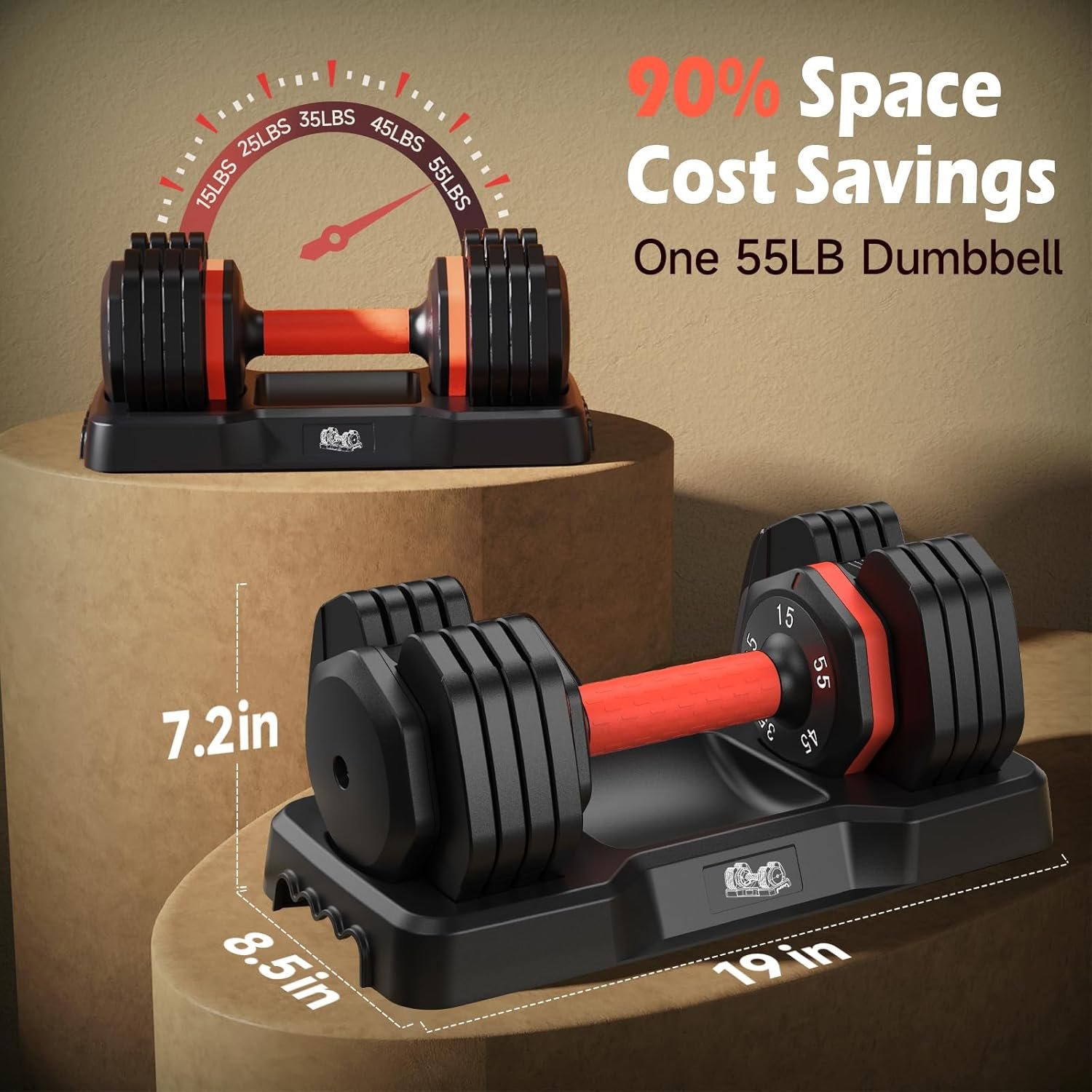 【55LBS Adjustable Dumbbells Pair】You will receive 2 piece 55LBS Adjustable Dumbbells.. Adjustable Dumbbell Set of 2. Each dumbbell offers 5 weight options (15 lbs, 25 lbs, 35lbs, 45 lbs, 55 lbs), Total 110LBS.