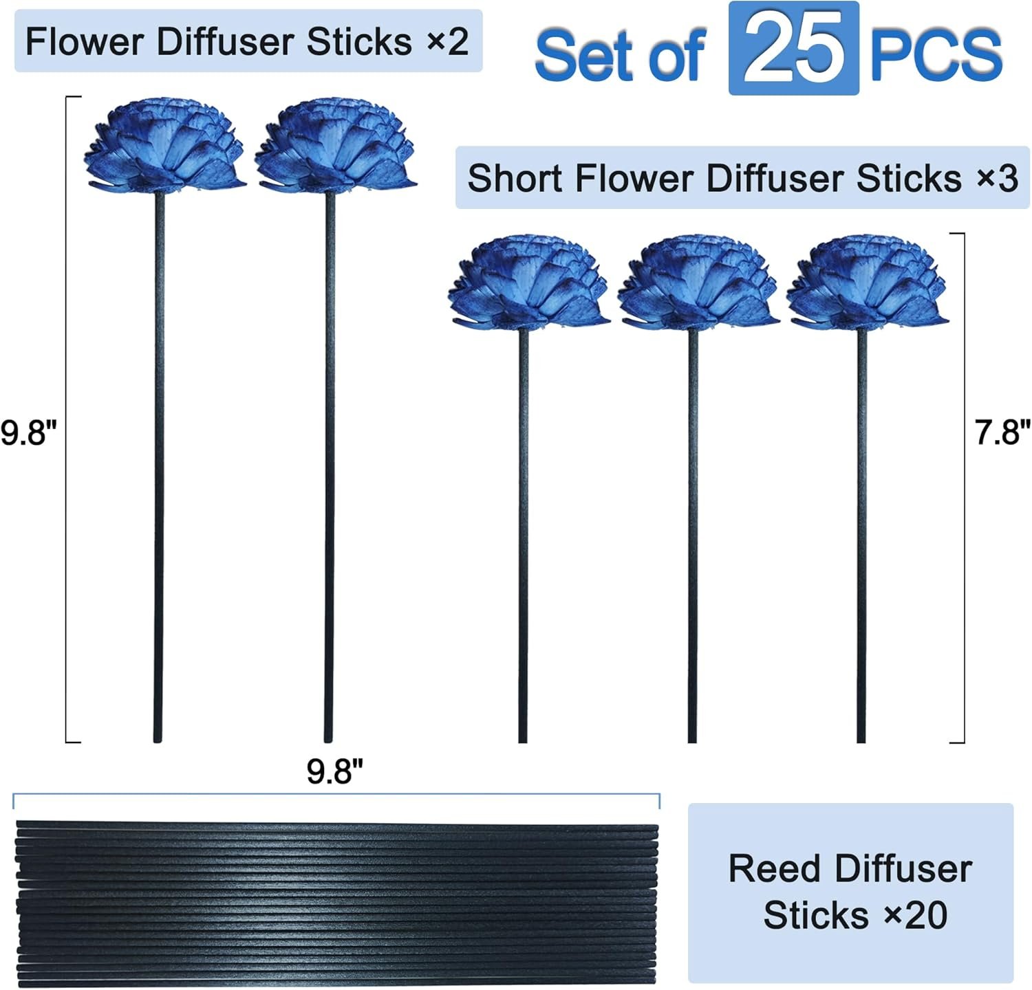 Diffuser Stick Set : Package contains 25pcs diffuser sticks with various style, 3pcs 7.8 inch flower diffuser Sticks, 2pcs 9.8 inch flower diffuser Sticks, 20pcs 9.8 inch black reed diffuser sticks.