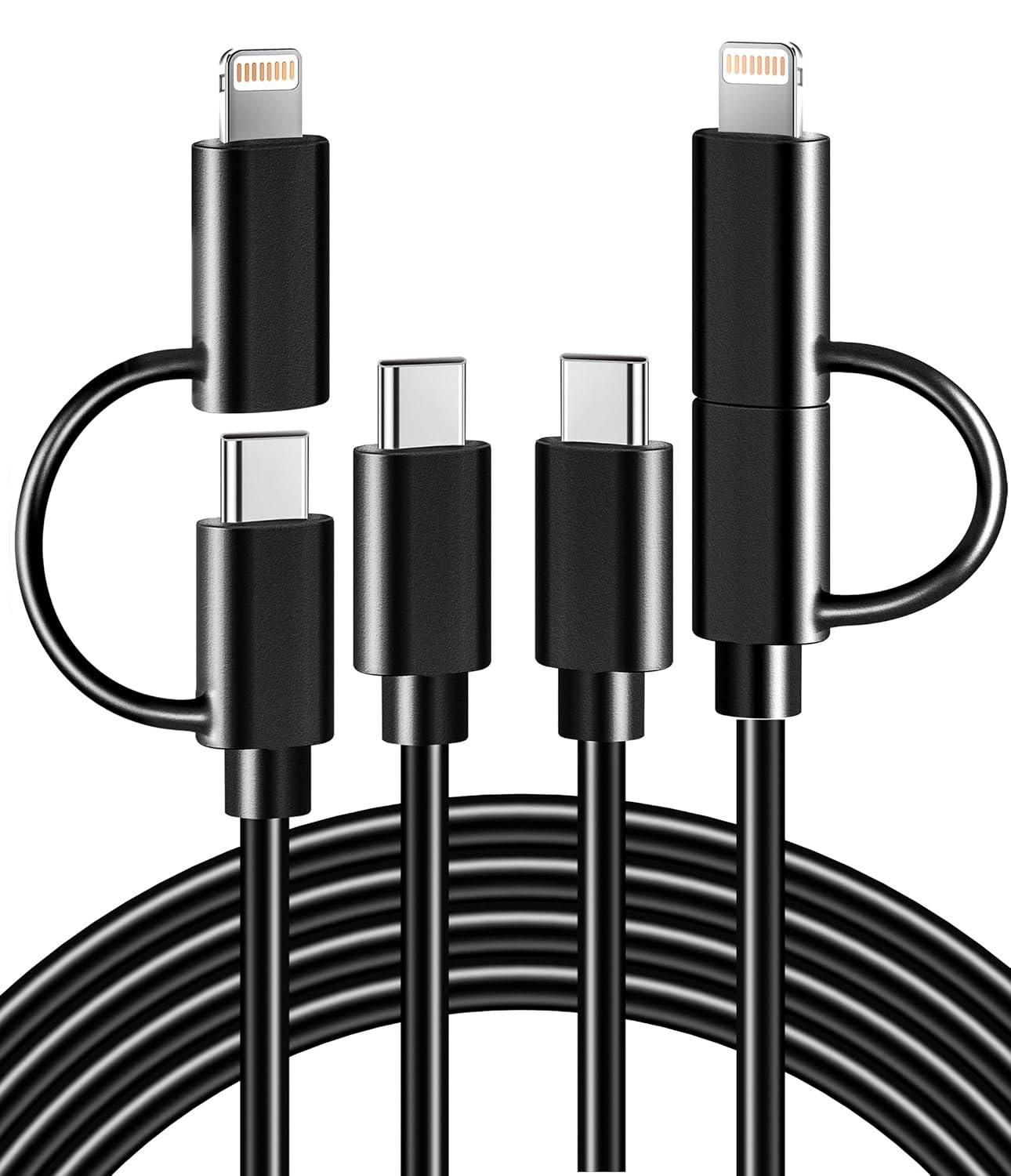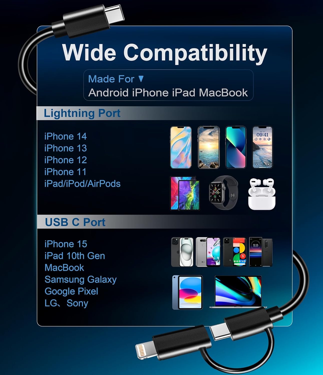 WIDE COMPATIBILITY: The Multiple USB C Charger Cable works well with Lightning/USB Type-C port devices. The lightning port is compatible with iPhone 14, 13, 12, 11 Plus / Pro / Pro Max / mini, iPhone SE, iPhone Xs / Xs Max / X / XR, iPhone 8, 7, 6, 5, iPad Air / Pro / mini, AirPods, iPod; And the USB-C port is the perfect fit for iPhone 15 Pro Max 15 Plus 15 Pro, iPad 10th generation/Pro/Air/Mini, Samsung Galaxy, Google Pixel, LG, Moto and more phones/tablets/laptops.