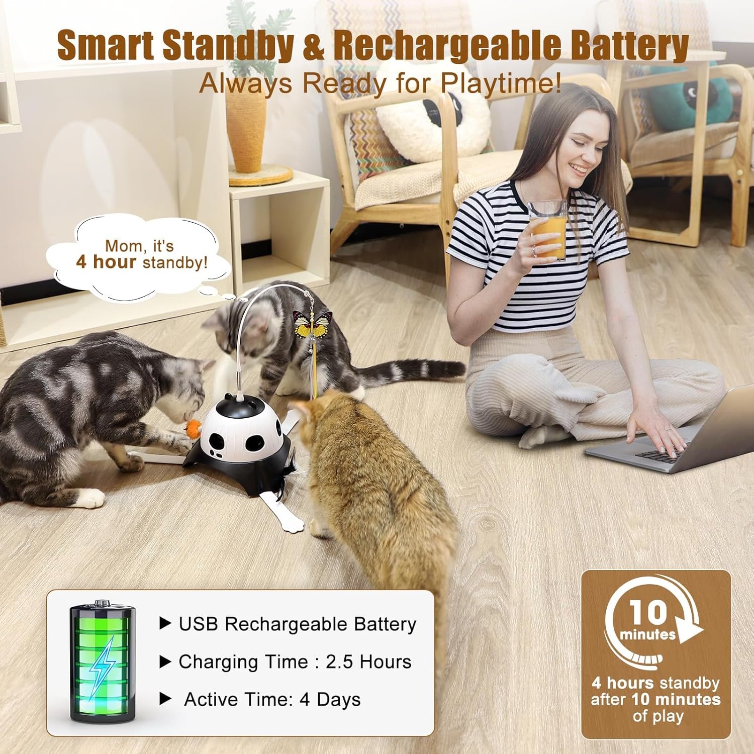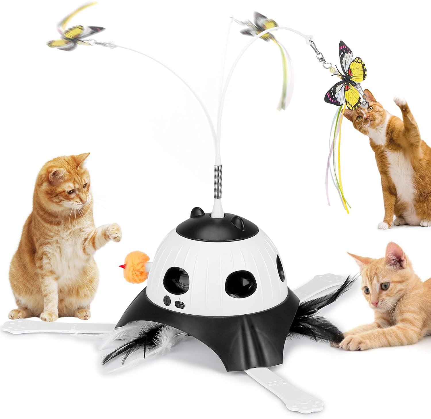 [Four Entertainment Modes] – The newly upgraded multifunctional cat feather toy features four exciting modes to cater to different cats! You can easily switch between them using the on/off button. Press once to activate the flying butterfly mode, twice for whack-a-mole mode, three times for the rotating feather wand mode, four times to activate both whack-a-mole and rotating feather wand modes simultaneously, and five times to turn off the toy. Watch your cat have a blast!