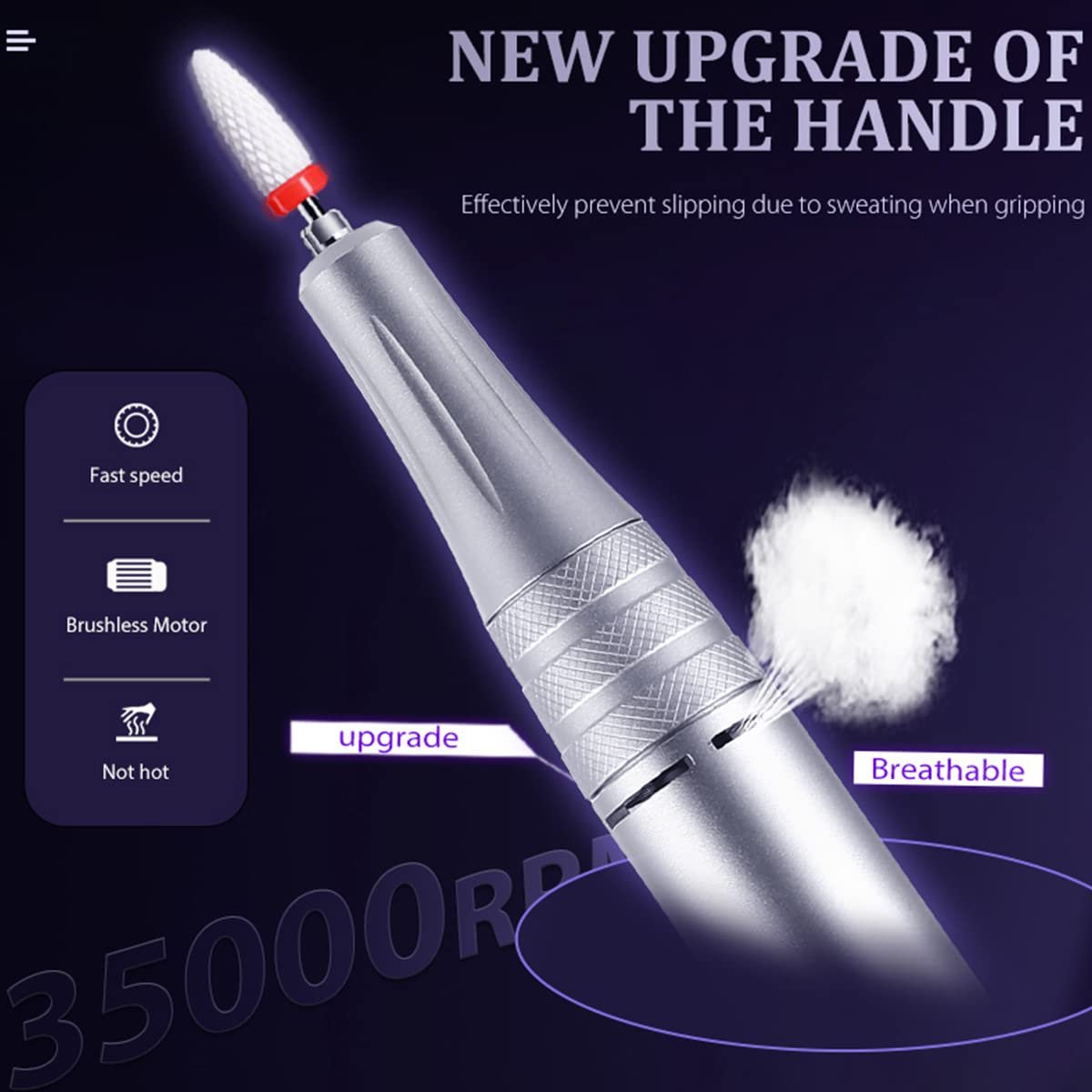 High Speed Up to 35000 RPM: The professional manicure drill is equipped with high-quality bearings, which enable it to work smoothly at a high speed adjustable from 0-35000RPM, easy to control the speed, suitable for left-handed or right-handed use. Low heat, low noise, ultra-low vibration, powerful and smooth. This acrylic nail drill is perfect for both beginners and professionals.