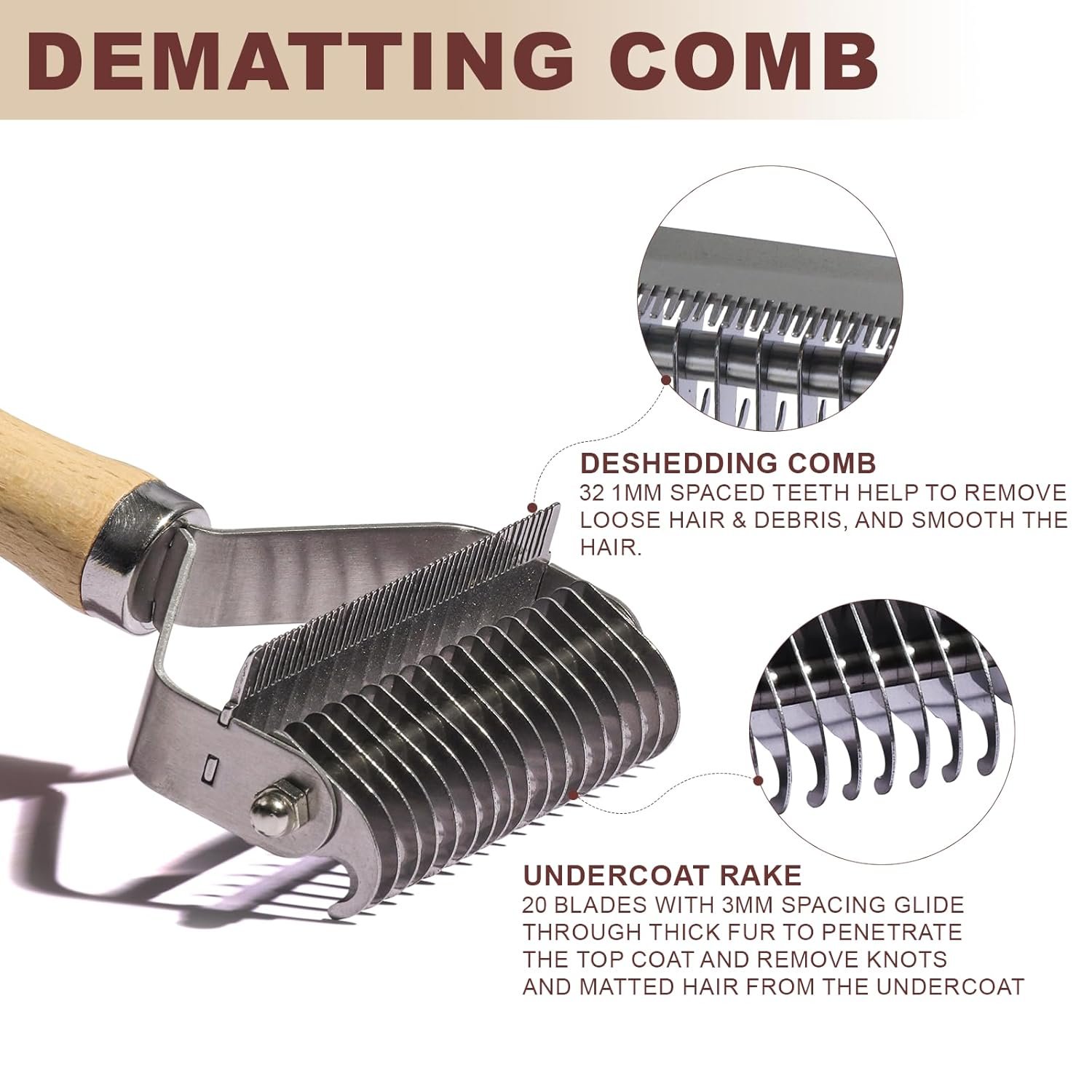 DOUBLE SIDED DESIGN Our detangling comb with 2 sides (wood + metal) is designed with two sides to effectively detangle and remove carpets and knots from your pets coat. The solid wood handle is perfect for daily grooming and maintenance, while the metal side is ideal for tackling carpets and hard knots