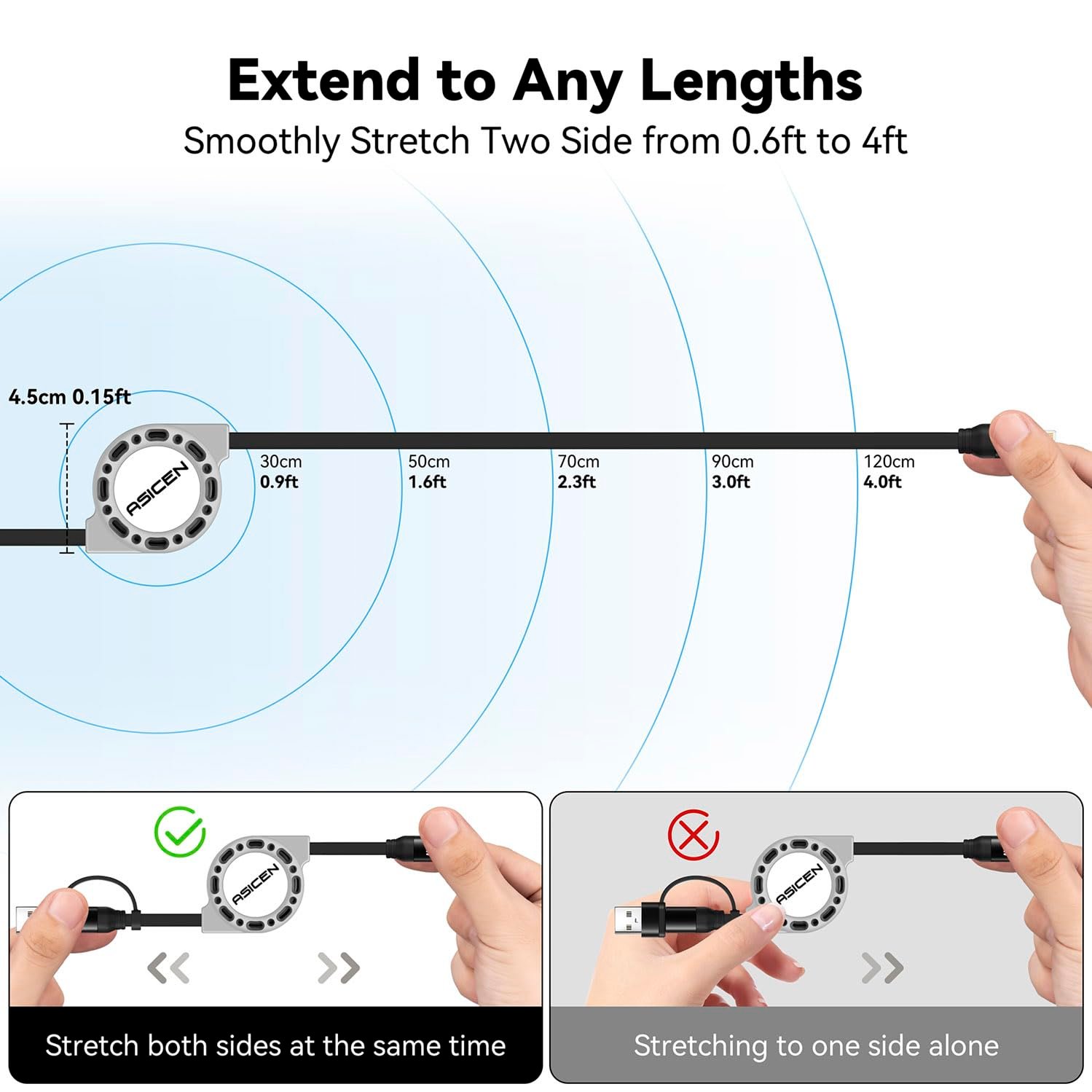 ⚡【WHAT YOU GET】: ASICEN 2-Pack 4ft 3-in-1 Retractable Universal High Speed Output Charging Cables, 12-month 100% friendly customer service.