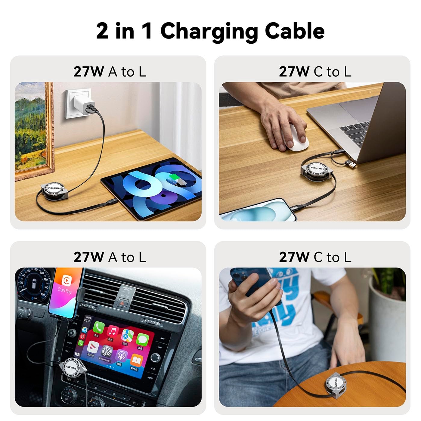 3 in 1 Retractable iPhone Charger Cable provides combines three modes – USB A to Lightning, USB C to Lightning, and USB A to Adapter – in one cable. Just this one lightning cable can meet your daily charging needs.