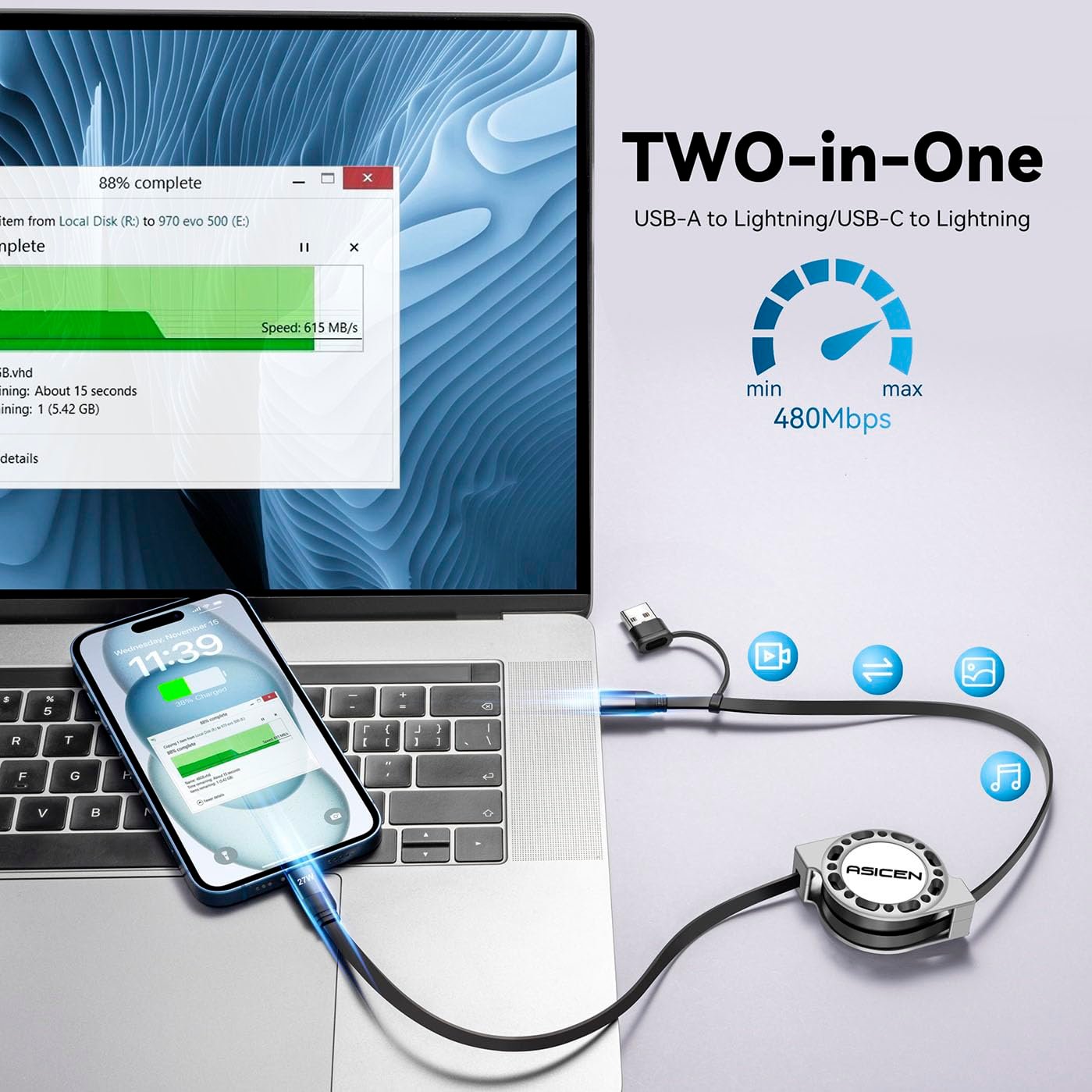 ⚡【3 in 1 Retractable USB A/C to Lightning Design】: This 3-in-1 Retractable charging Cable is designed to simplify your charging setup. It combines three modes – USB A to Lightning, USB C to Lightning, and USB A to Adapter – in one cable.Keep your workspace clean with our efficient Multi USB 3-in-1 Charger Cable
