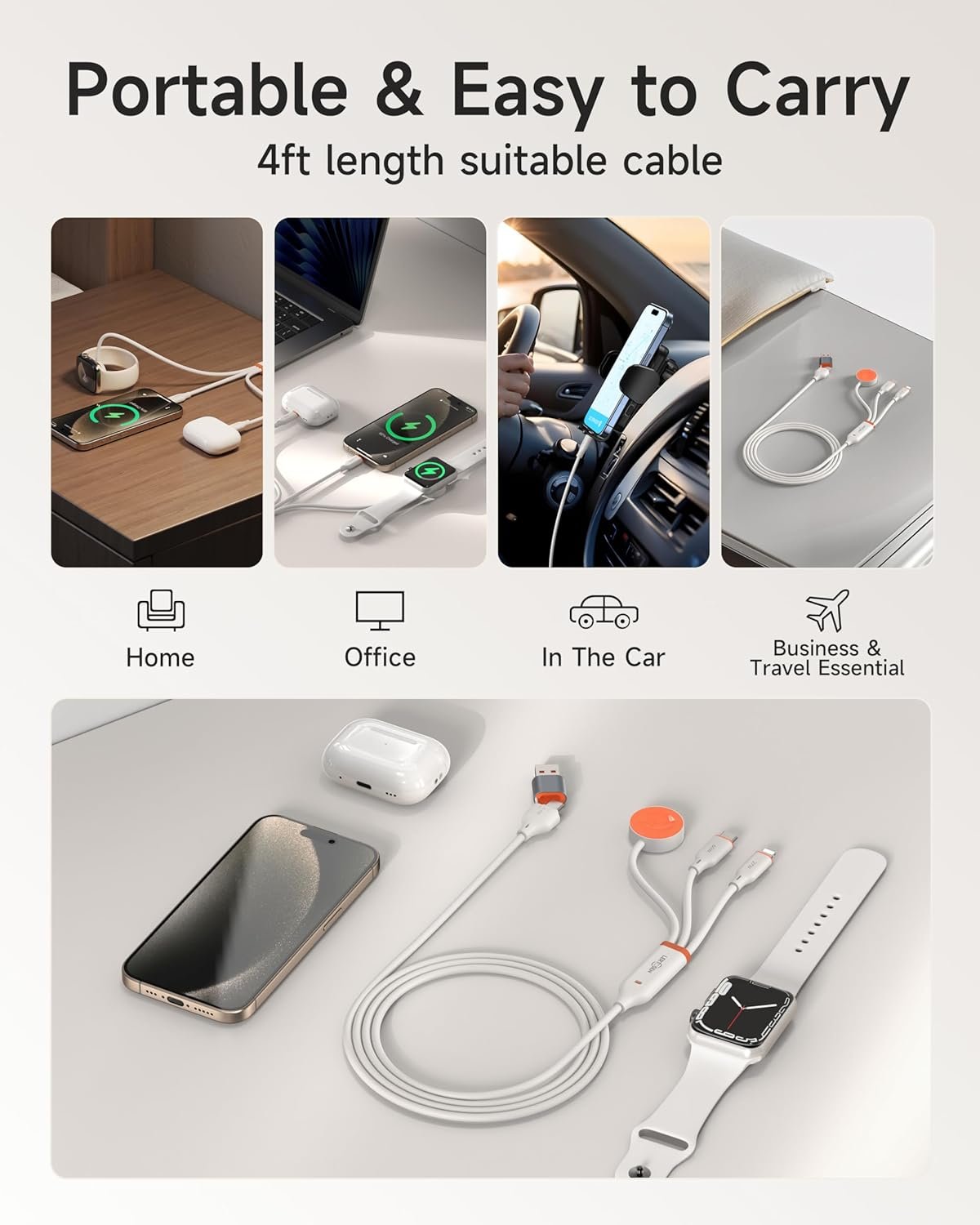 Travel Essentials & Portable Design: With lightweight and portable design, this 4 feet 3-in-2 charging cable fits in your travel bag take it on the go or simply use at home and office, charge your Apple watch and iPhone anywhere anytime