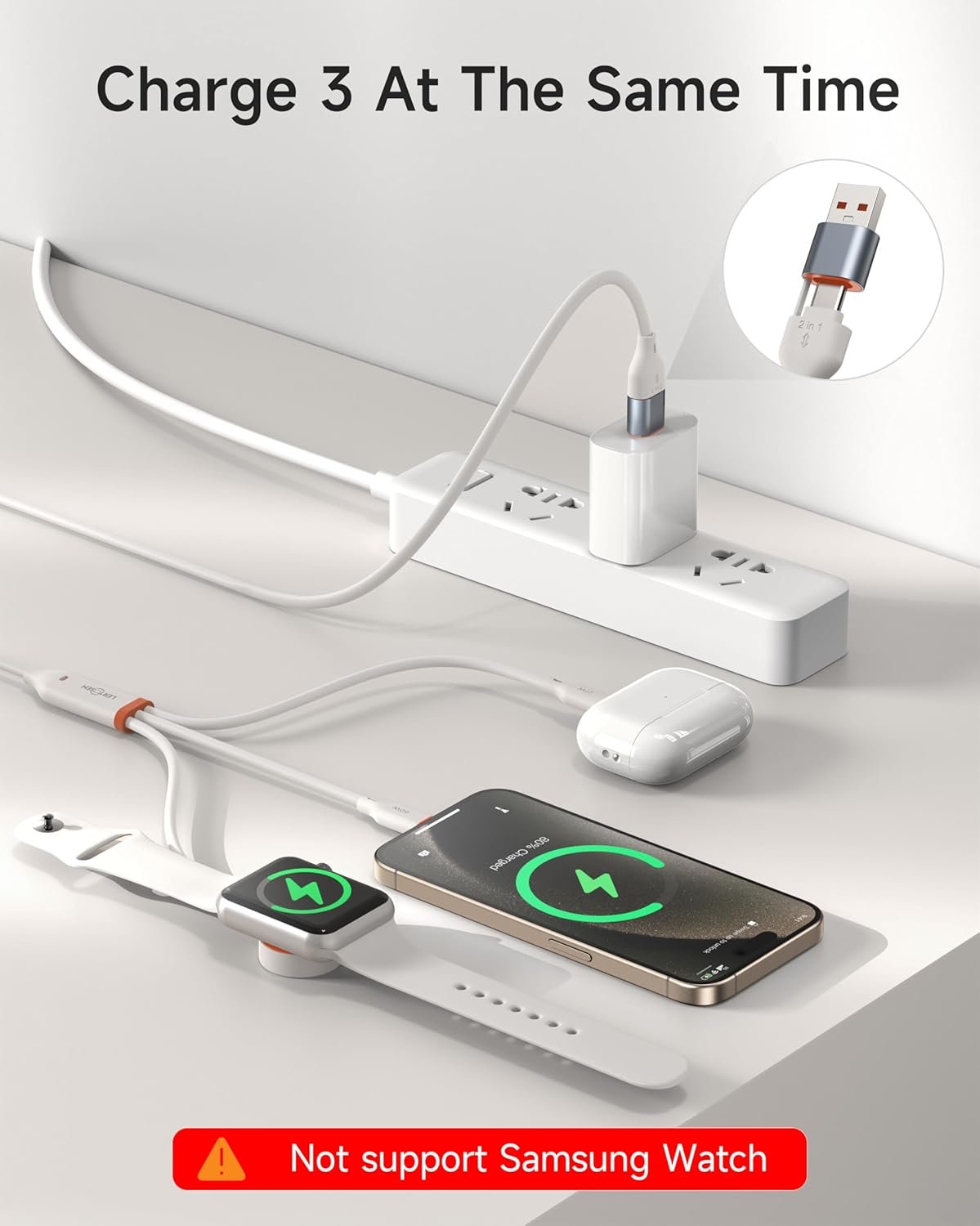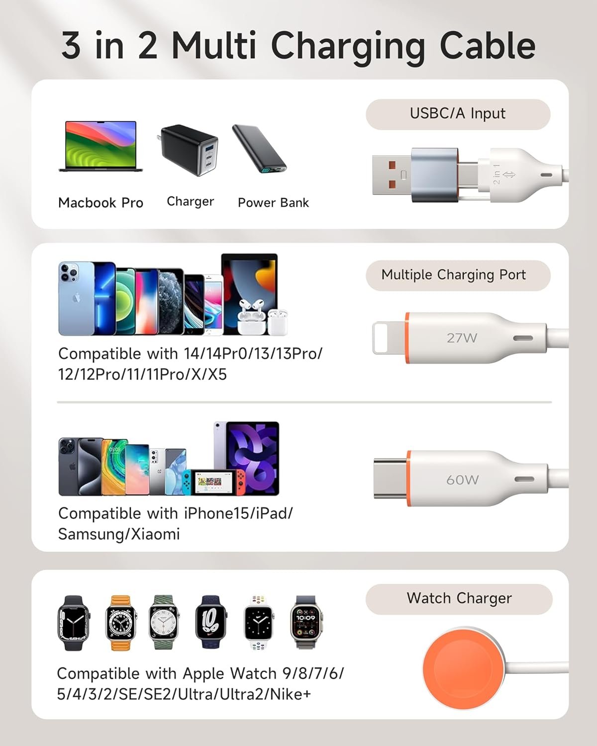 3 in 2 Multi Charging Cable: This versatile and convenient charging solution offers 6 charging ways to power up your devices which are USB C/A to iWatch charger,USB C/A to Lightning cable,USB C/A to Type C Cable. The multiple charging cord supports simultaneously charge 3 devices with a USB C/A adapter( Not included ). Compatible for all iWatch ultra series 9/SE/8/7/6/5/4/3/2/1,the lightning Port is compatible with iPhone14/13/12/Pro/Max/iPad,USB C is for iPhone 16/16 Plus/16 Pro/16 Pro Max/15/15 Pro/15 Plus/15 Pro Max,Samsung Galaxy S24/S23/ S23+/ S23 Ultra/S22/ S21/ S20/ S20+