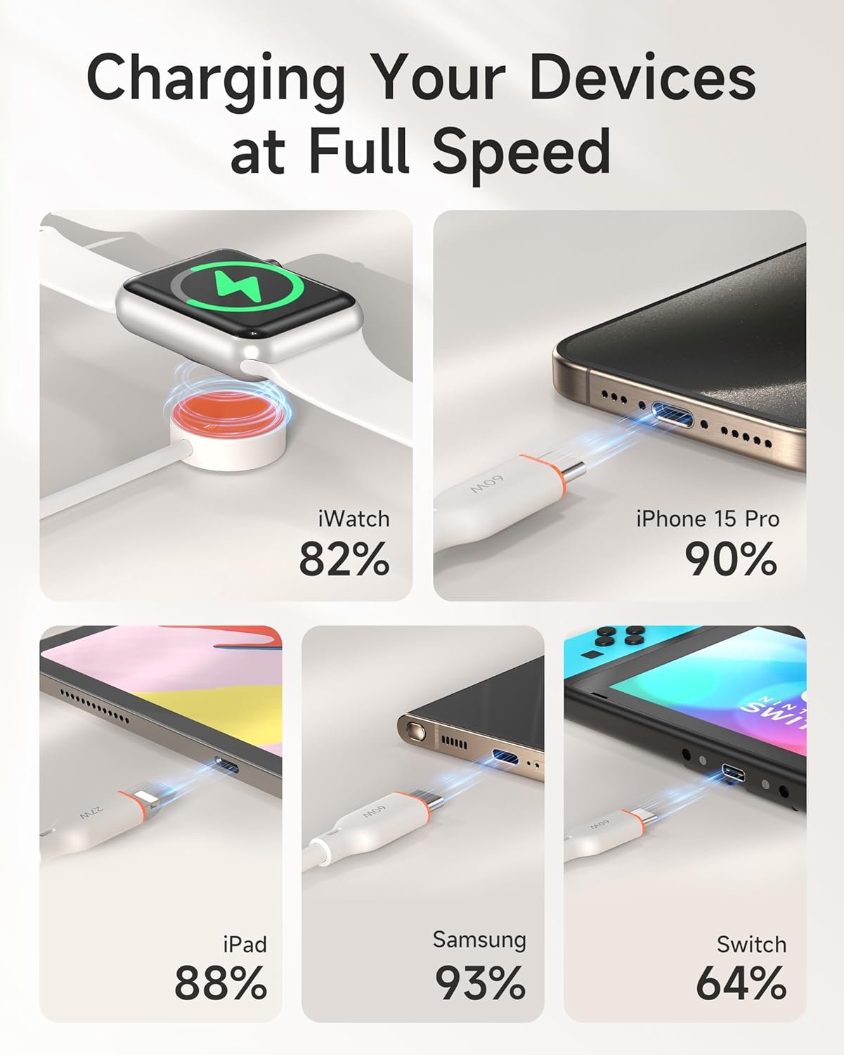 Support Fast Charging, Saving More Time: This type c to phone cable supports fast charging up to 2A Max, delivering efficient power to your devices. Charges iPhone from 0% to 45% within 35 minutes, iWatch up to 50% within 45 minutes.For better charging experience, we recommended using a 20W USB-C Power Adapter (not included) or or higher to avoid charge interruption protection. Note: This cable does not support data transfer