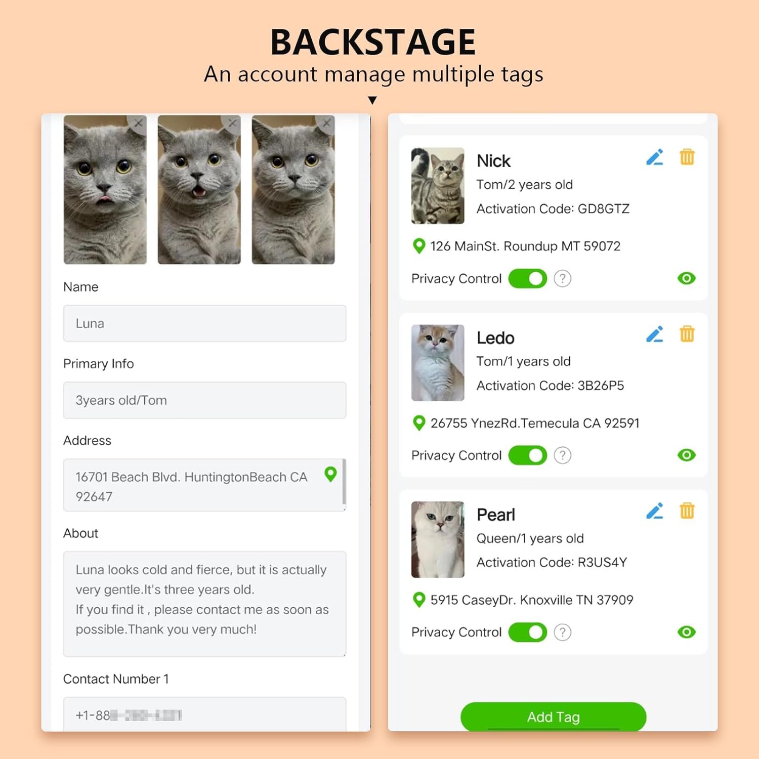 2.【Setup & Use】 Scan the QR code to activate the tag.Link to profile page containing important information about pet, you can edit emergency contact,name, photos,home address and medical history . It is easy to manage and update the information stored on it when your address and phone number changed