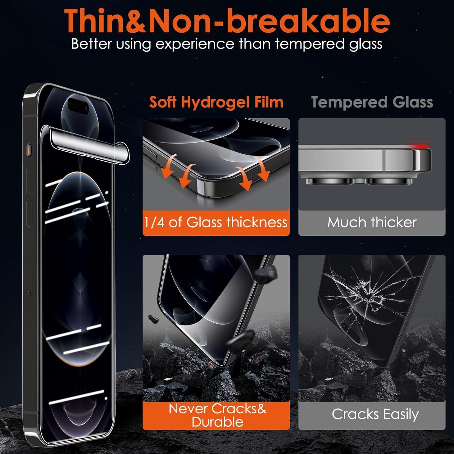 【Protective&Never Cracks】- This is a NON-GLASS screen protector made of flexible high-density nano TPU. It offers the same protection as tempered glass, preventing your screen from getting scratched or cracked when dropped, but the difference is that it never cracks so you don’t have to keep replacing it.