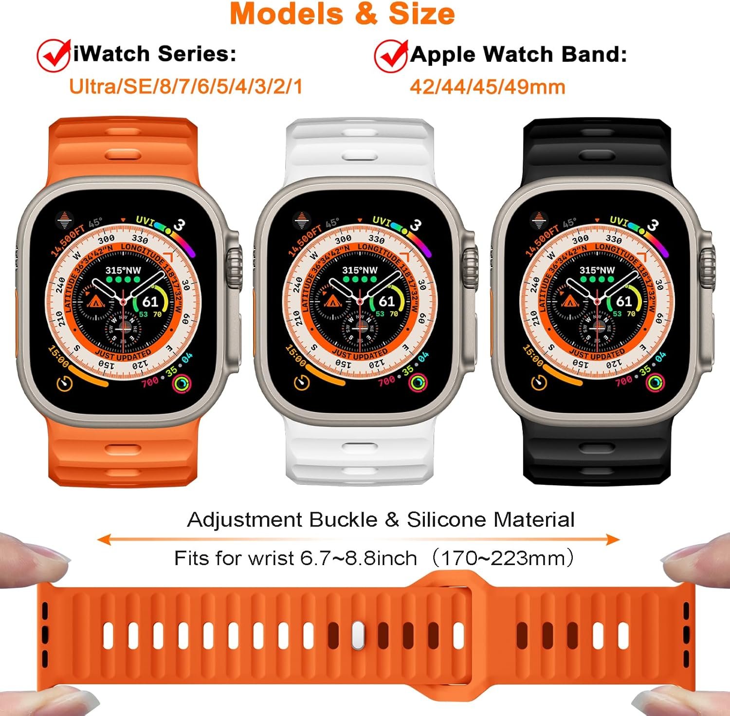 【Models & Size】Compatible for iWatch Series Ultra2/Ultra1 SE/9/8/7/6/5/4/3/2/1 and Nike+, Hermes, and Edition. Compatible with Apple Watch Band 49mm 45mm 44mm 42mm, Suitable for 170mm–223mm (6.7″- 8.8″inch) wrist.