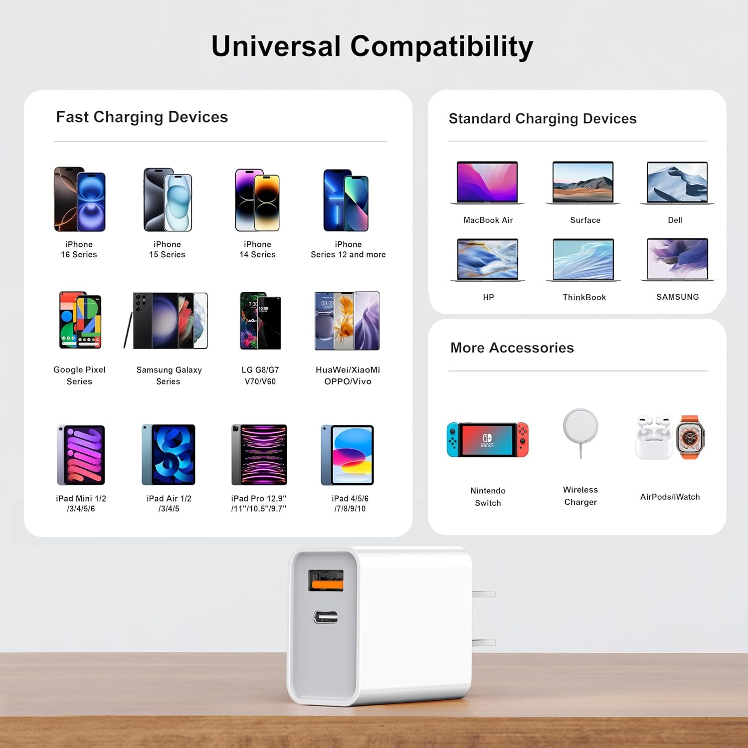 3 Pack Dual Port Charger: Compatible for iPhone 16/15/15 Pro/ 15 Pro Max/15 Plus/14/14 Plus/14 Pro/14 Pro Max/13/13 Pro Max/13 Pro. Block two in one – USB-A and USB-C ports to charge two devices simultaneously at high speed. Minimize waiting time and frees you from messy chargers with various interfaces