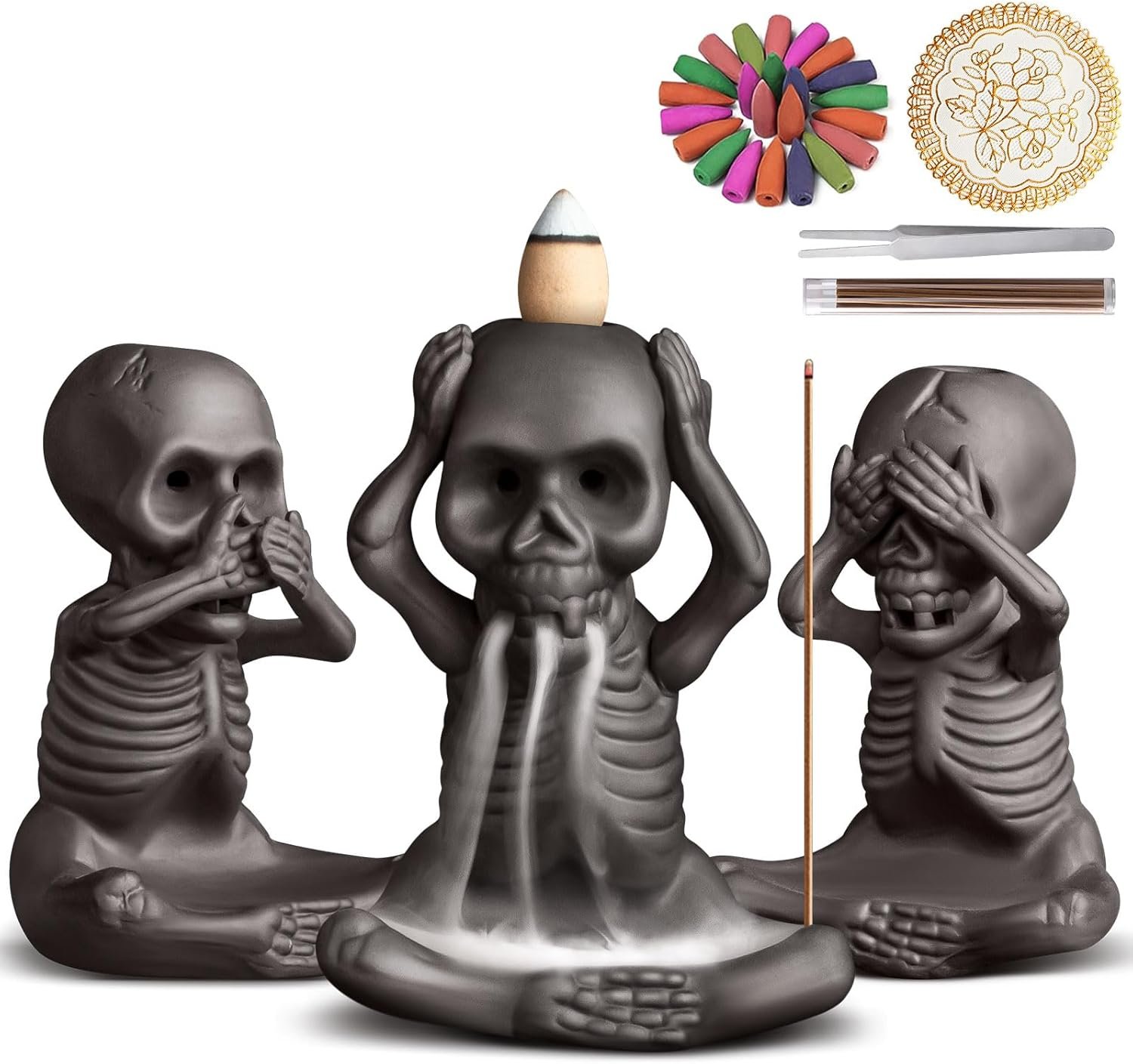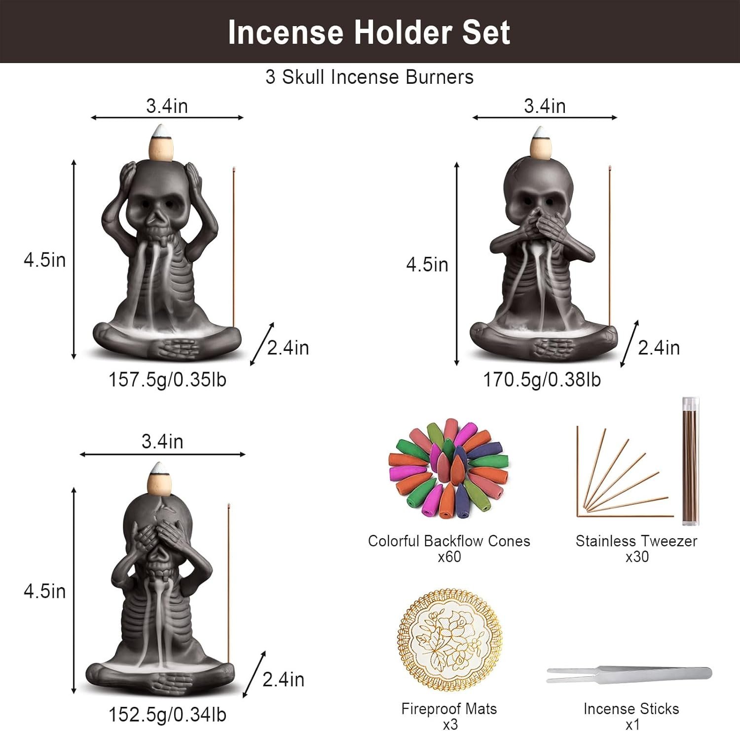 3 PCS Incense Holder, Backflow Incense Burner, Skull Incense Fountains for Home Decor, Desk Decor