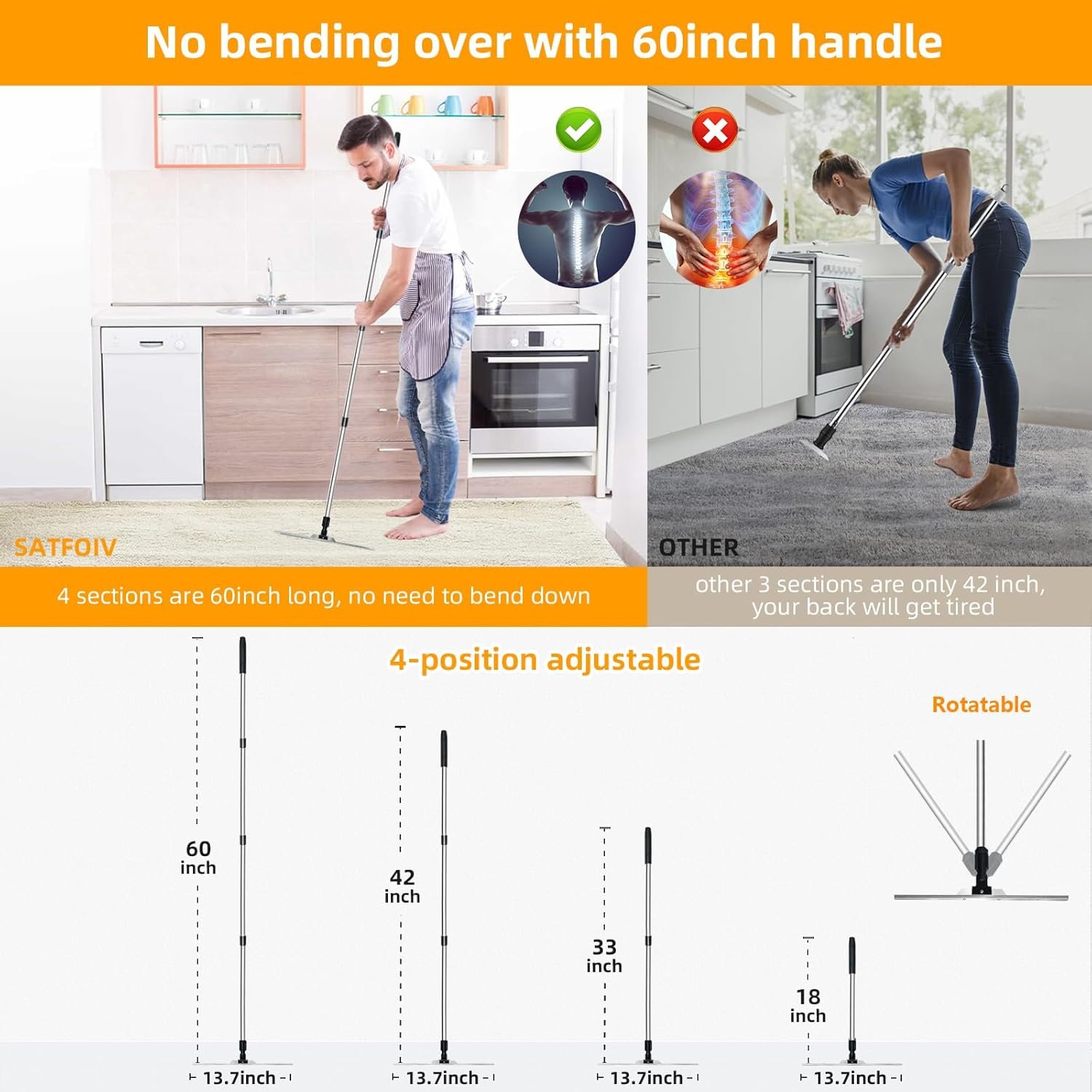[▶ADJUSTABLE 60 INCH STAINLESS STEEL HANDLE◀] The handle of the dog hair remover consists of 4 sections of high quality stainless steel, the length can be adjusted between 60 inches, 42 inches, 33 inches, 18 inches, say goodbye to kneeling and bending down, don’t have to suffer from the associated back pain, convenient for people of all ages to use, thickened stainless steel tube and plastic sleeve design to prevent breakage, very sturdy