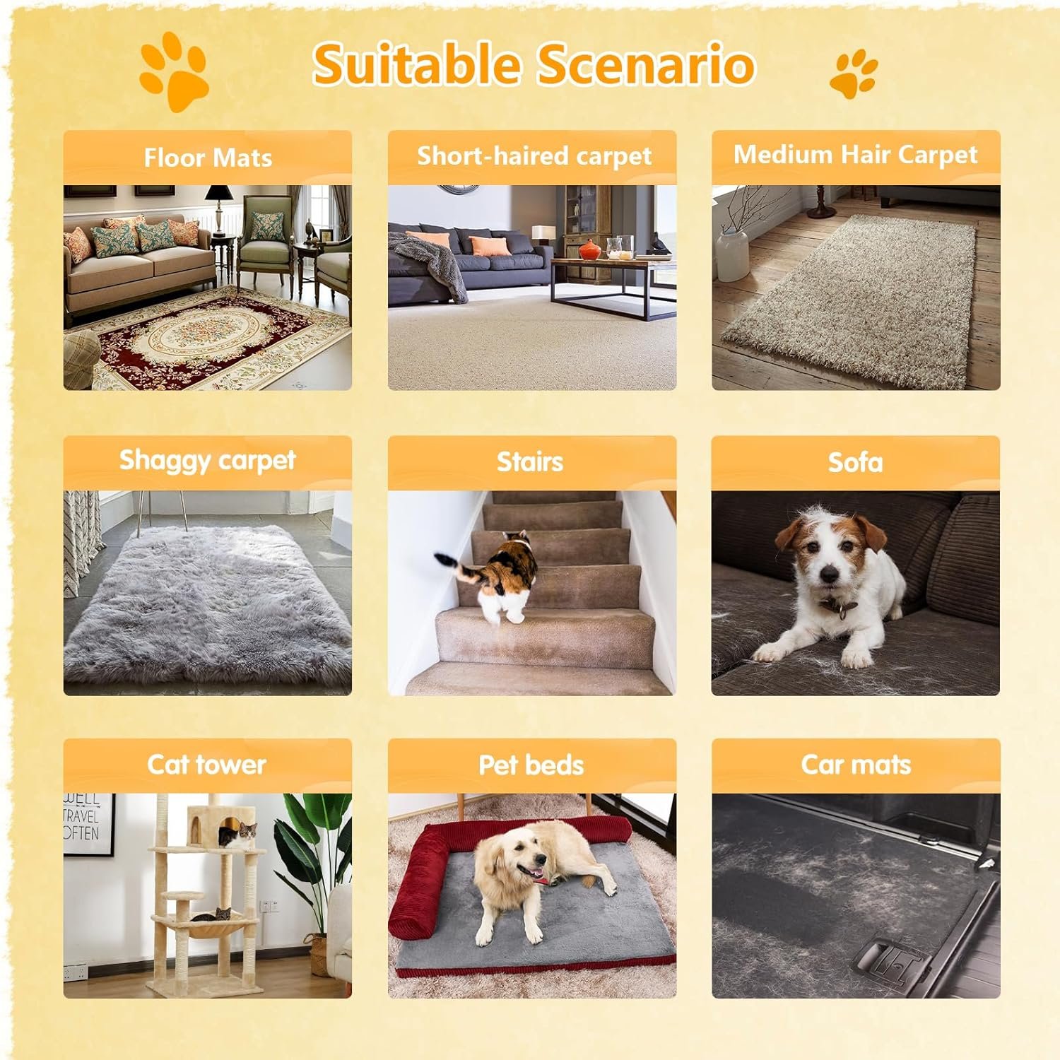 [▶PLEASE NOTE◀] 1.First time to use, please try it with light strength to prevent scratching the carpet, 2.The fine scraping teeth are a bit sharp, although it won’t scratch, but still need to pay attention to it 3.lint remover Not applicable to knitted clothes, sweaters, leather sofas, quilts sheets, etc., please enjoy the good time with your furry friends!