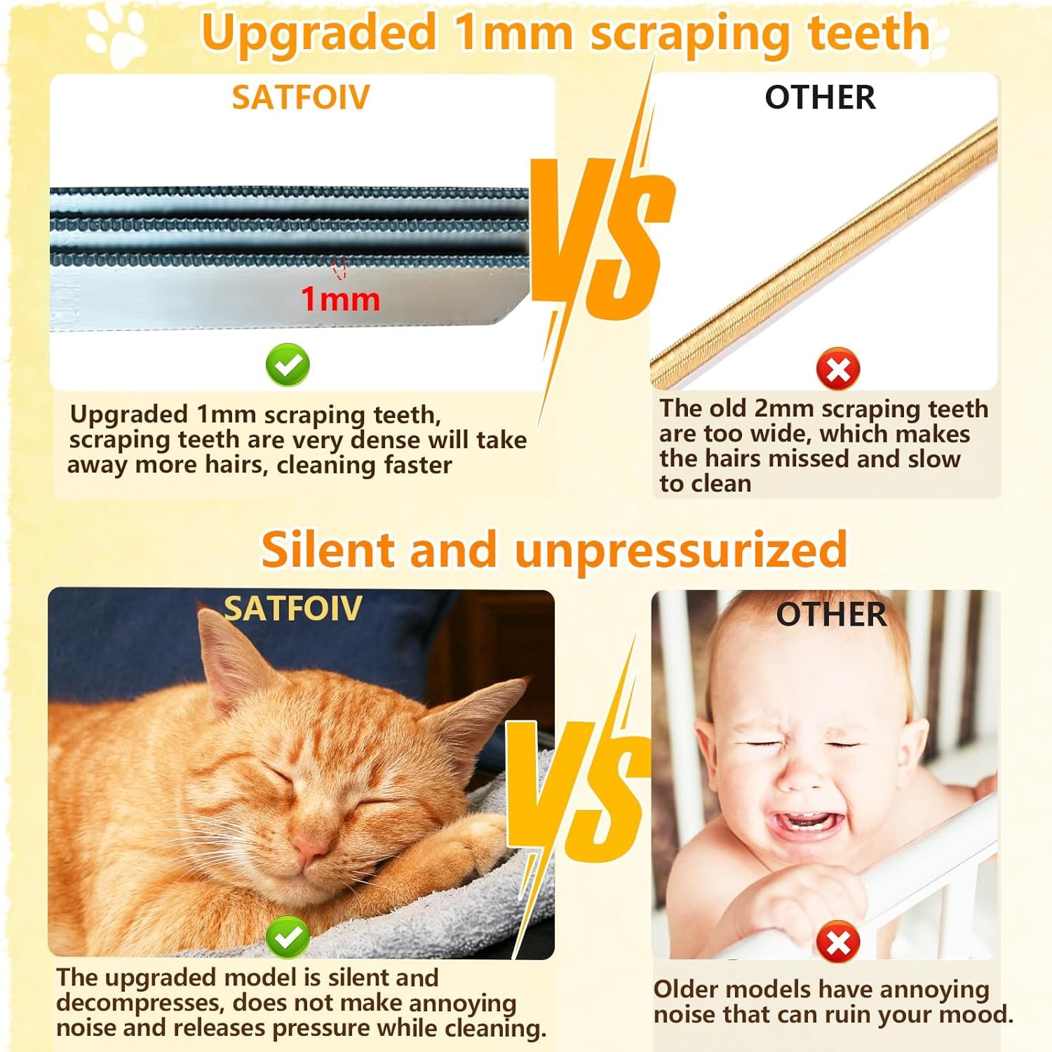 [▶1mm TEETH+DOUBLE SCRAPER◀] Compared to other shavers with 2mm teeth width, our pet hair removal broom use ultra-high technology to make the spacing between each tooth no more than 1mm, other shavers with 2mm teeth width will let more hairs pass through the gap, while our 1mm teeth width can stop more hairs, easy to remove stubborn, embedded carpet hair, lint and dust, in addition, we use the upper and lower double scraper teeth design, more convenient to use. Convenient