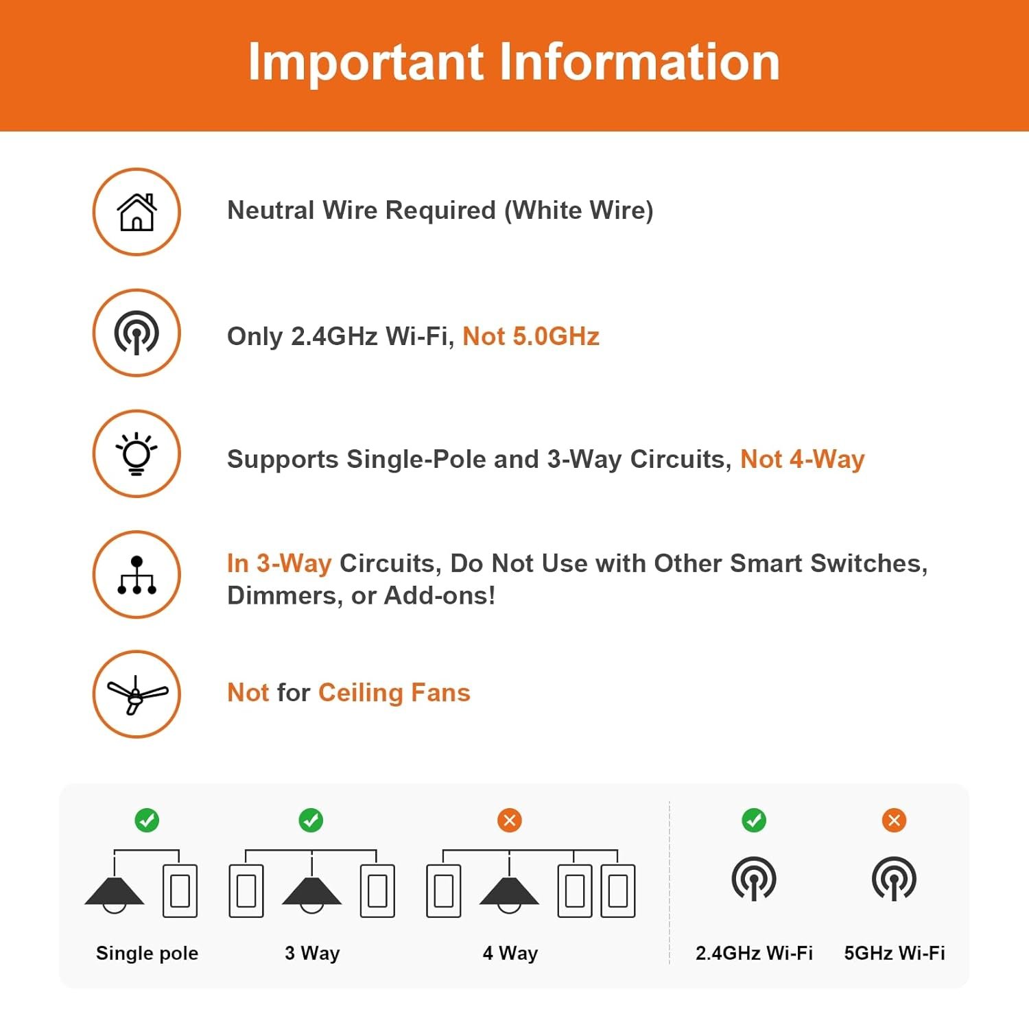 【Very Important Tips Before Purchase】: Please check our image information carefully and confrim follwing information before your purchase!!! This is smart dimmer switch. Installation requires a neutral wire! Supports only 2.4GHz Wi-Fi networks, not 5GHz! Maximum load: 500W Incandescent, 150W LED, 1000W Resistive! Supports single pole and 3-way for two locations, not compatible with 4-way! Only connect to standard 3-way switches, not for smart, dimmer, or add-on switches! Not recommended for fan