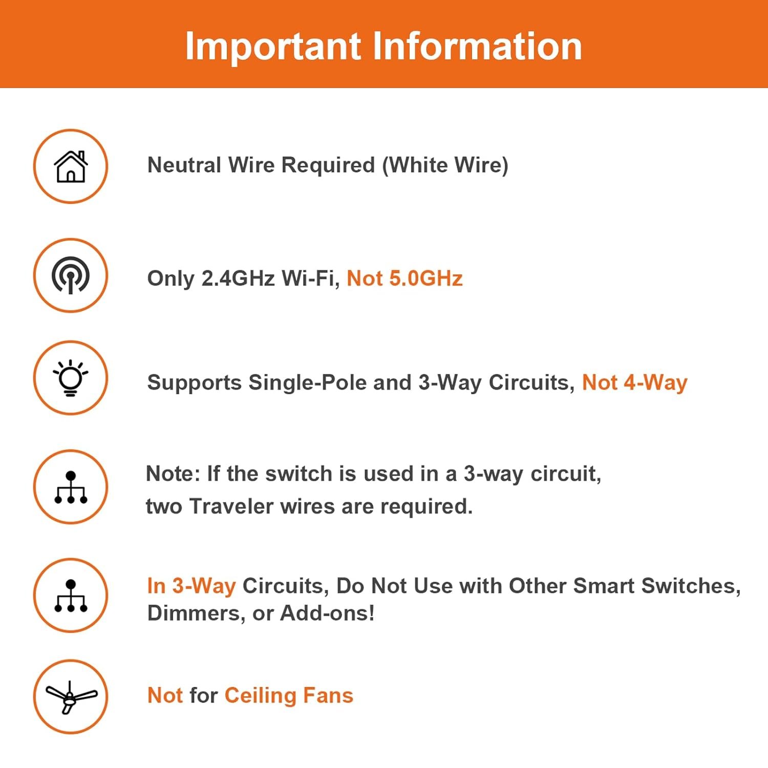 【Important Tips Before Purchase】: Requires neutral wire! Supports 2.4GHz Wi-Fi only (no 5GHz)! Note: If the switch is used in a 3-way circuit, two Traveler wires are required. Max load: 500W Incandescent, 150W LED, 1000W Resistive!