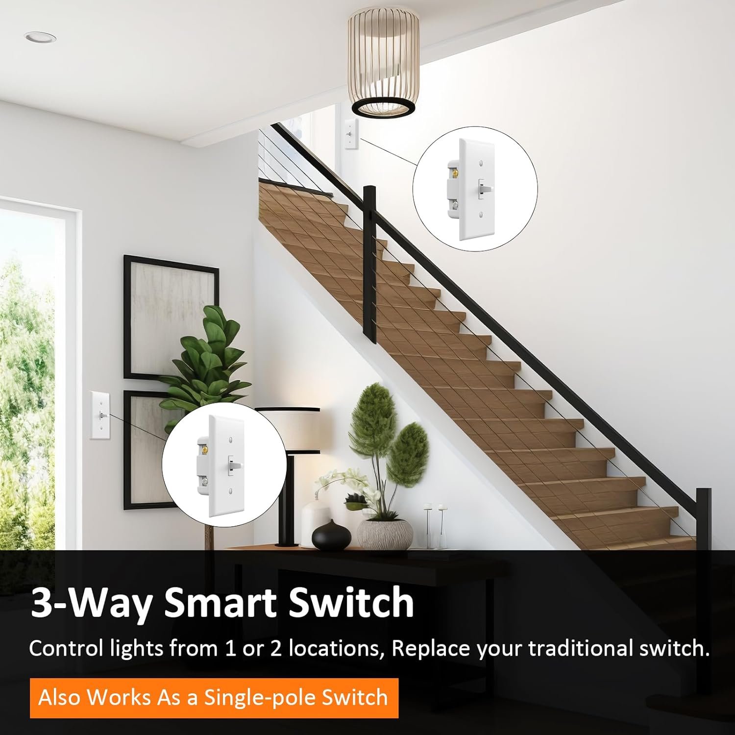 【3-Way or Single Way Smart Switch】: Use it as a 3-way or single pole switch to control lights from one or two locations, replacing your traditional switch. Ideal for stairs or between house and garage. In a 3-way circuit, do not use with other smart switches, dimmers, or add-ons! Not for fans!