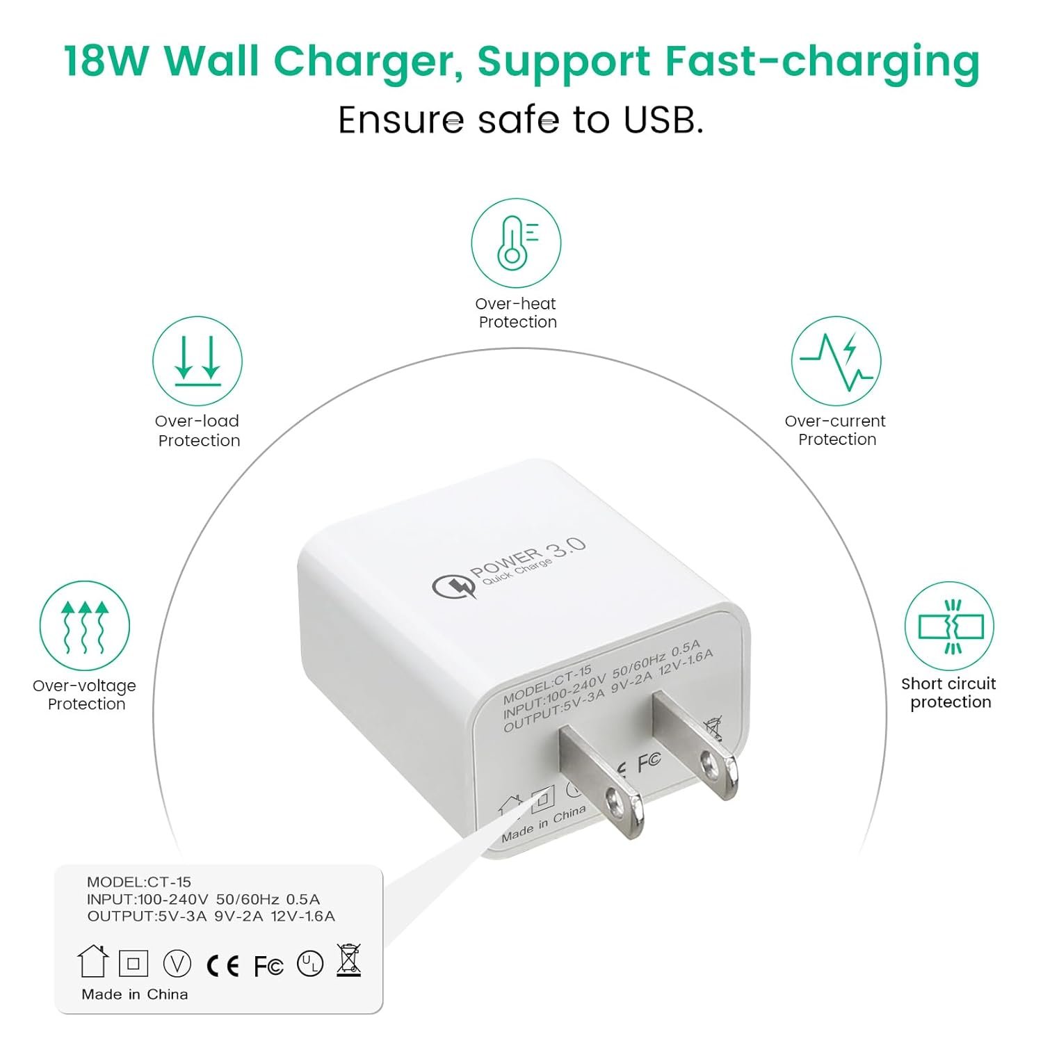 18W wall charger, supports fast-charging; Built in smart chip-set, provide over-voltage, over-load, over-heat, over-current and short circuit protection