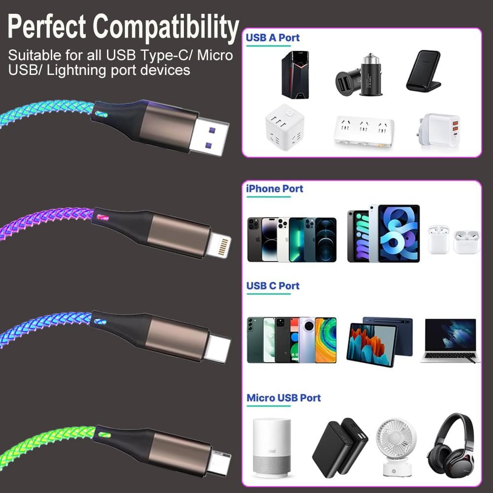 Perfect Compatibility: Our LED USB Multiple charger cord is suitable for all USB Type-C/ Micro USB/ Lightning port devices. For example compatible with Samsung Galaxy S23 S22 S21 S20 S10 S9 S8 S7 A51 A50 A70 A3 A5 A7 A9 J3 J5 J7, iPhone 15 14 13 12 11 Pro XS Max XR X 8 7 6, Google Pixel 2XL 3XL 4XL 5XL, LG G5 G6 G7 G8 V20 V35 V50, Kindle/ Huawei/ Xiaomi/ Ho-nor/ H-TC/ No-kia/ Moto-rola/ So-ny/ One-plus/ PS4/ Ec-ho Dot/ Switch/ Headphones/ E-reader/ Power bank/ Bluetooth speaker/ Headphones/ Camera/ Android/ Tablet etc.