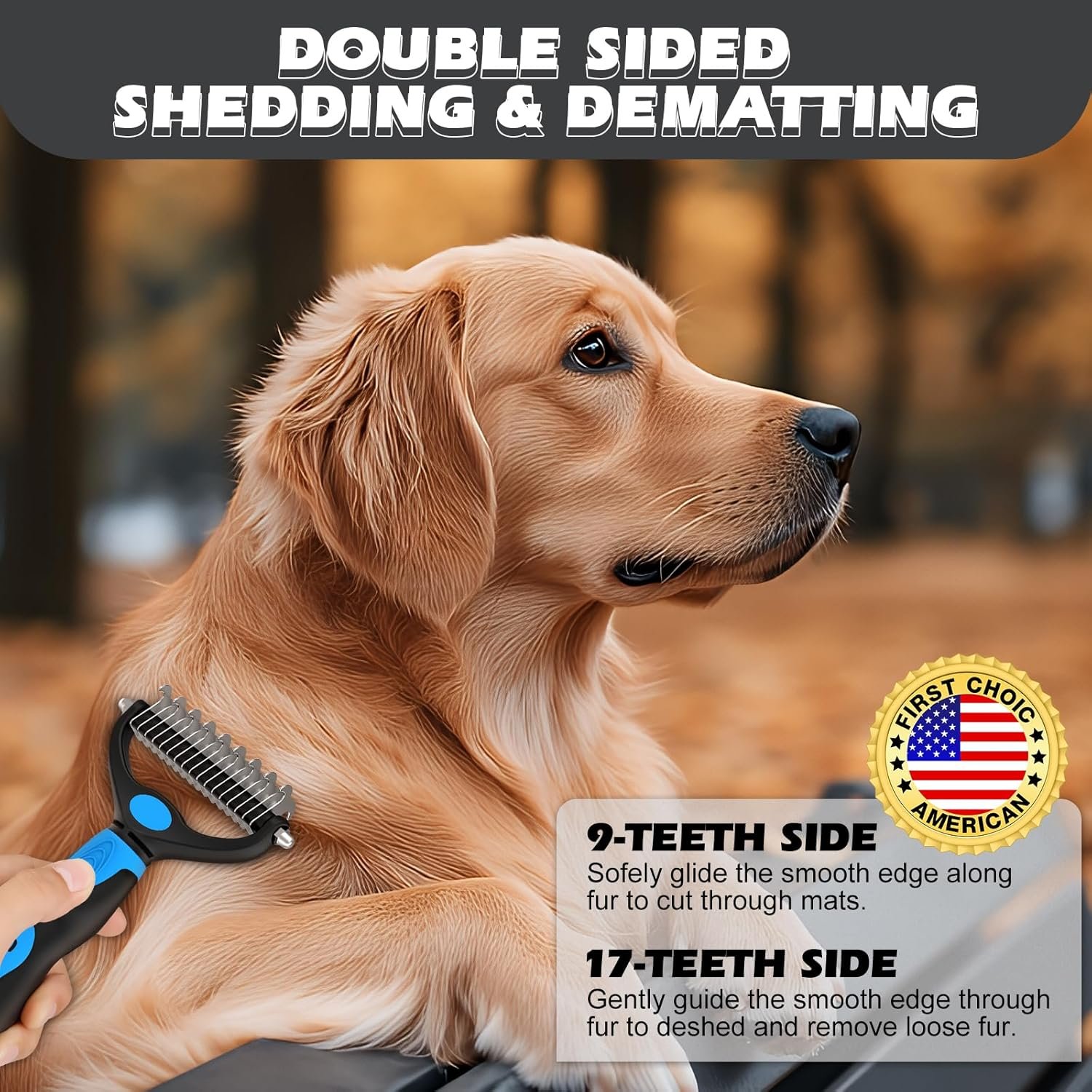 【Undercoat Rake】Our undercoat rake is perfect for de-shedding and de-matting medium to long-haired pets. Featuring a double-sided design, the 9-tooth side can be used for stubborn mats, tangles and knots, while the 17-tooth side can be used to thin and remove loose hair from dogs and cats.