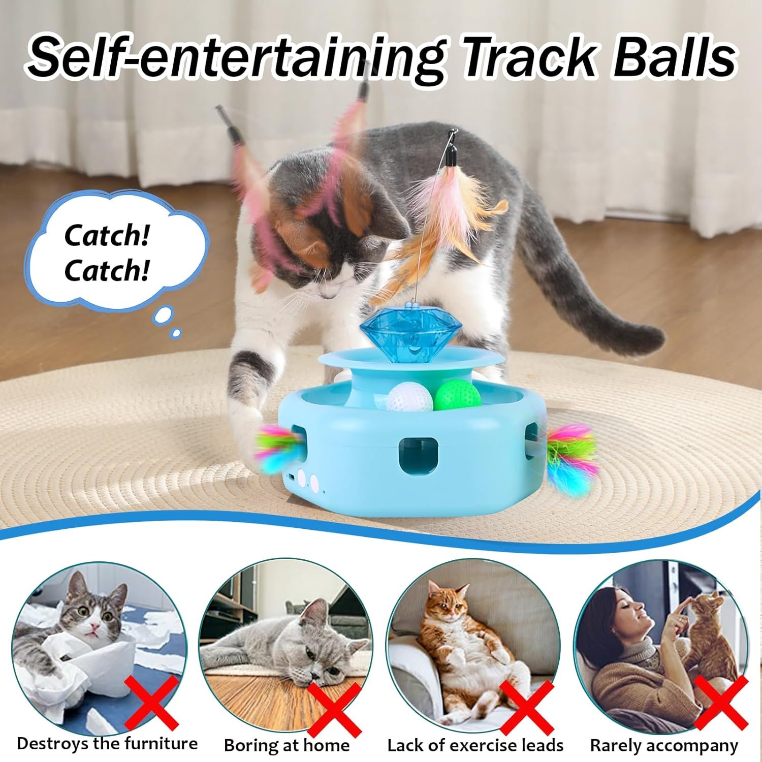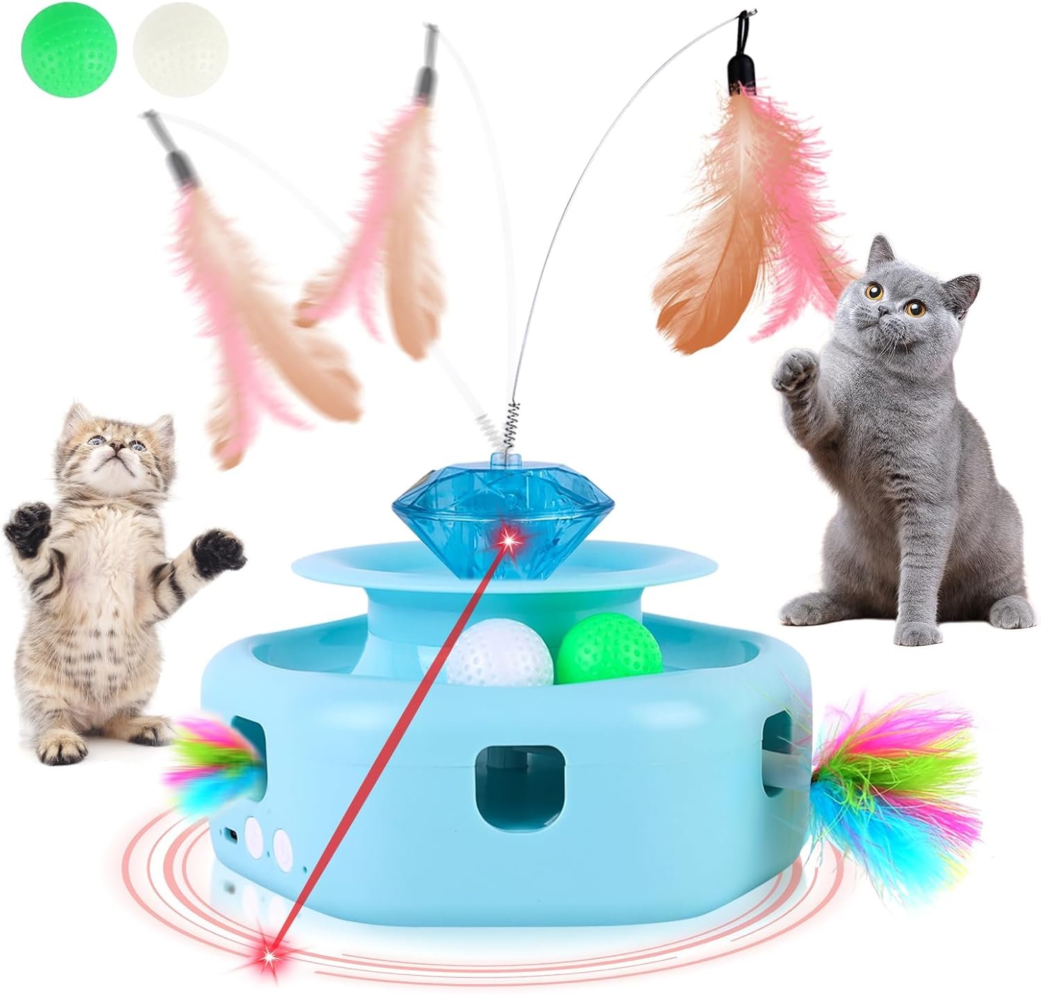 Most Versatile Cat Toy Ever: 2023 Newest 4-in-1 automated cat toys offer a unique design with four independent functions that can be used individually or combined. This kitten toy includes a red pointer, a rotating cat wand, two track balls, and a base magic box that shoots feathers to engage your cat.