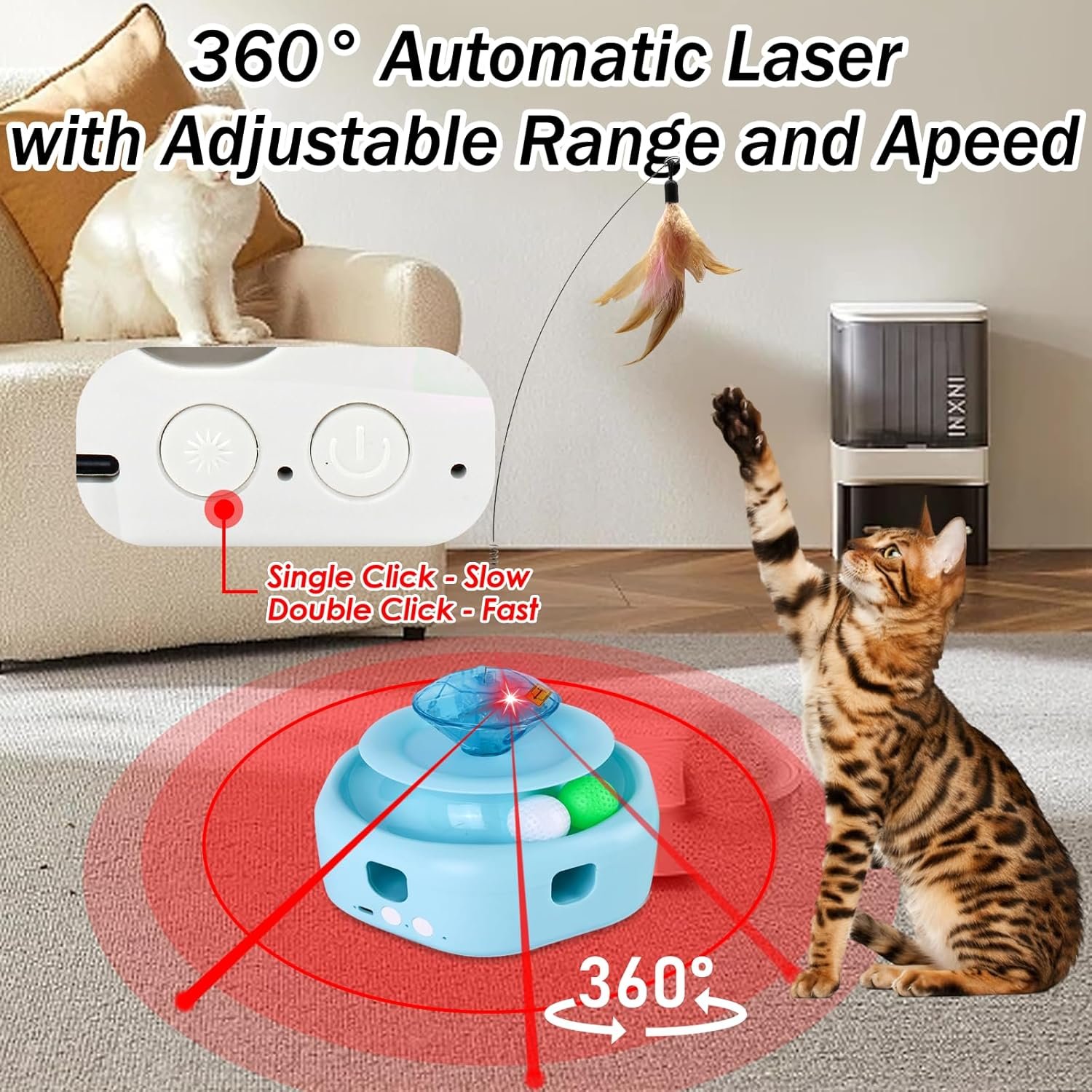 press, you can control the rotation speed of the cat wand. The red pointer angle can also be manually adjusted for optimal play, this cat interactive toys for indoor cats providing endless fun for your feline friend.