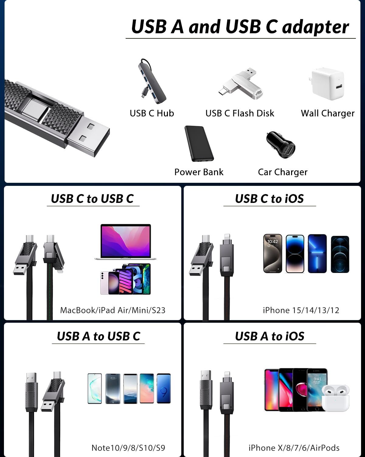 【4-in-1】 The OGRANEE 4-in-1 charging cable combines four ports – USB A to C, USB A to Lightning, USB C to Lightning and USB C to USB C – in one cable. No need to carry multiple cables for different devices when traveling, greatly simplifying your life.