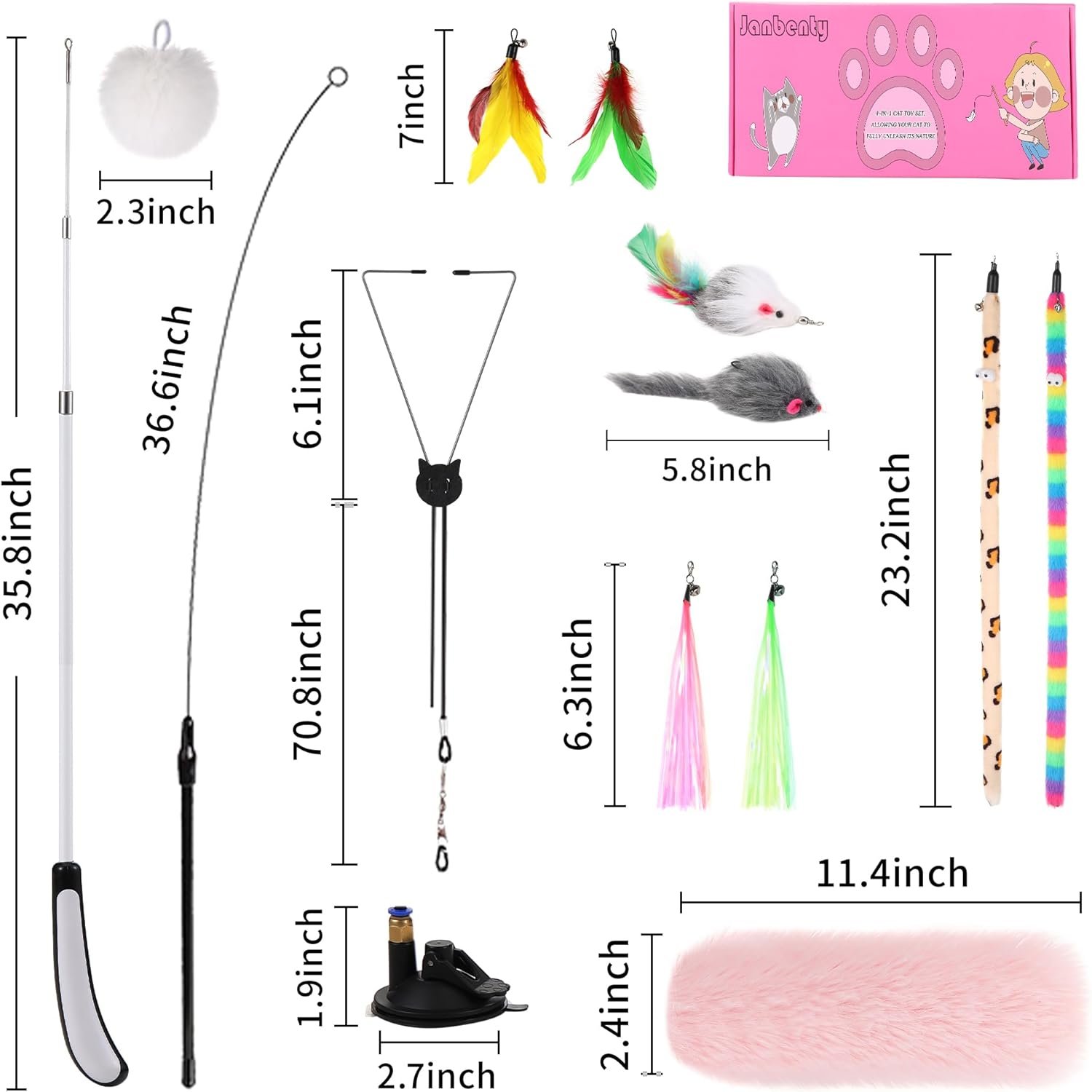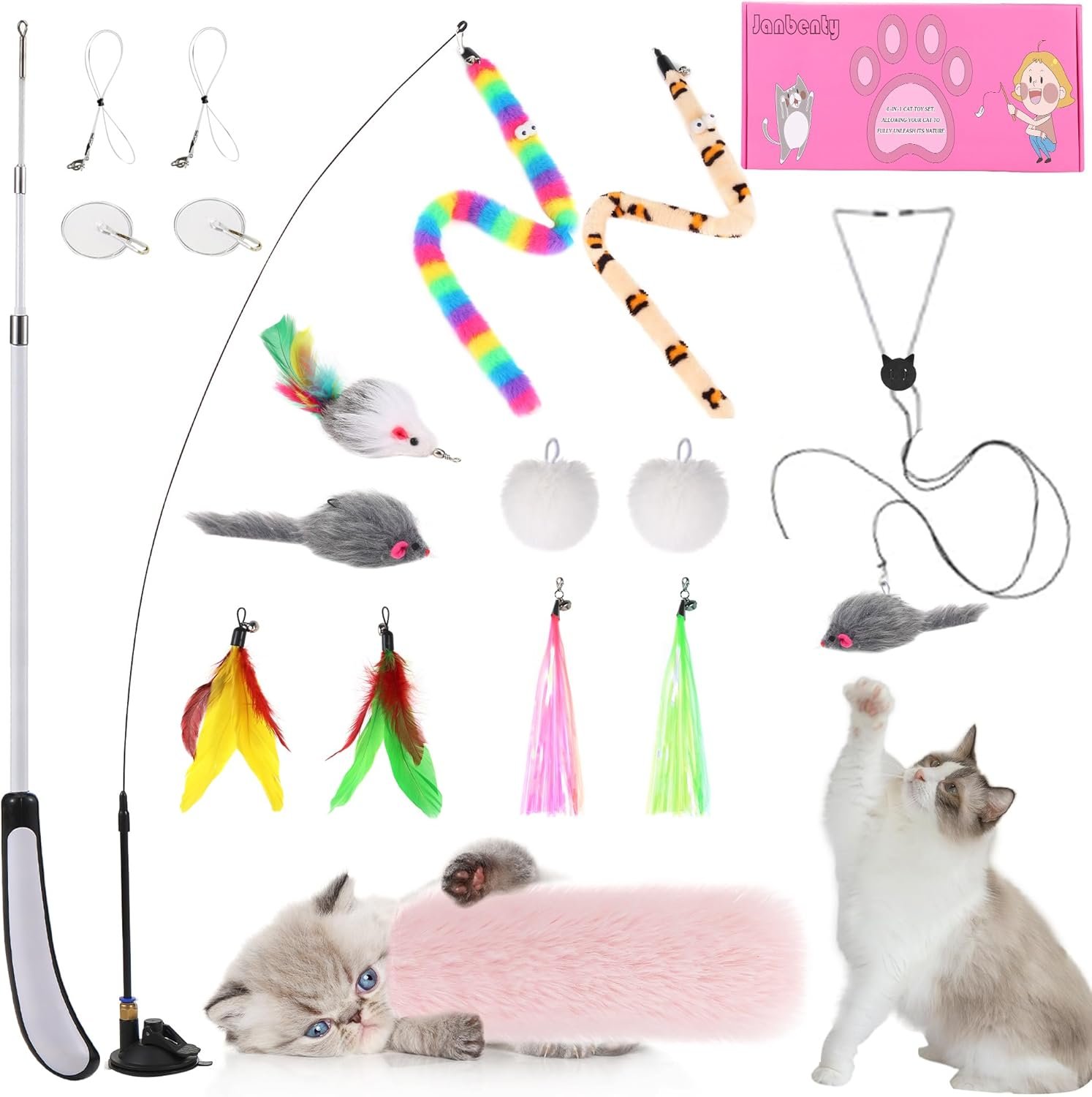 4-in-1 Cat Toy Set : 14 interactive cat toys pack are in a cute box,including 1 set enhanced suction cup cat toy,1 new retractable fishing pole cat toy,1 cat catnip toy,2 fur cat scratching balls,2 cat mouse toys,2 long worm cat toys,2 cat feather toys,2 Colorful tassels,1 cat triangle clip door toy,and additional 2 ropes,2 adhesive hooks.various cat toys styles provide a variety of game choices, providing your cat with multiple entertainment choices