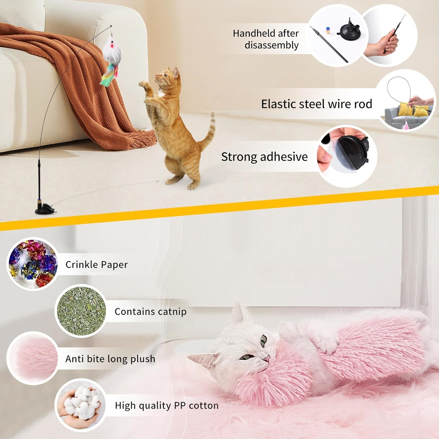 New Retractable Cat Wand and Enhanced Suction Cups : New cat wand features an ergonomic arc design,providing a comfortable grip during extended play sessions,which makes you comfortable and not tired when holding it for a long time.PP polypropylene plastic replaces the traditional foam handle,so that your cat can avoid the danger of swallowing foam.2.7″ large diameter suction cups of the cat toy base have been upgraded to strong glue can withstand 20 lbs,they can be pasted on smooth surfaces(ceramic tiles,glass,wooden floors)