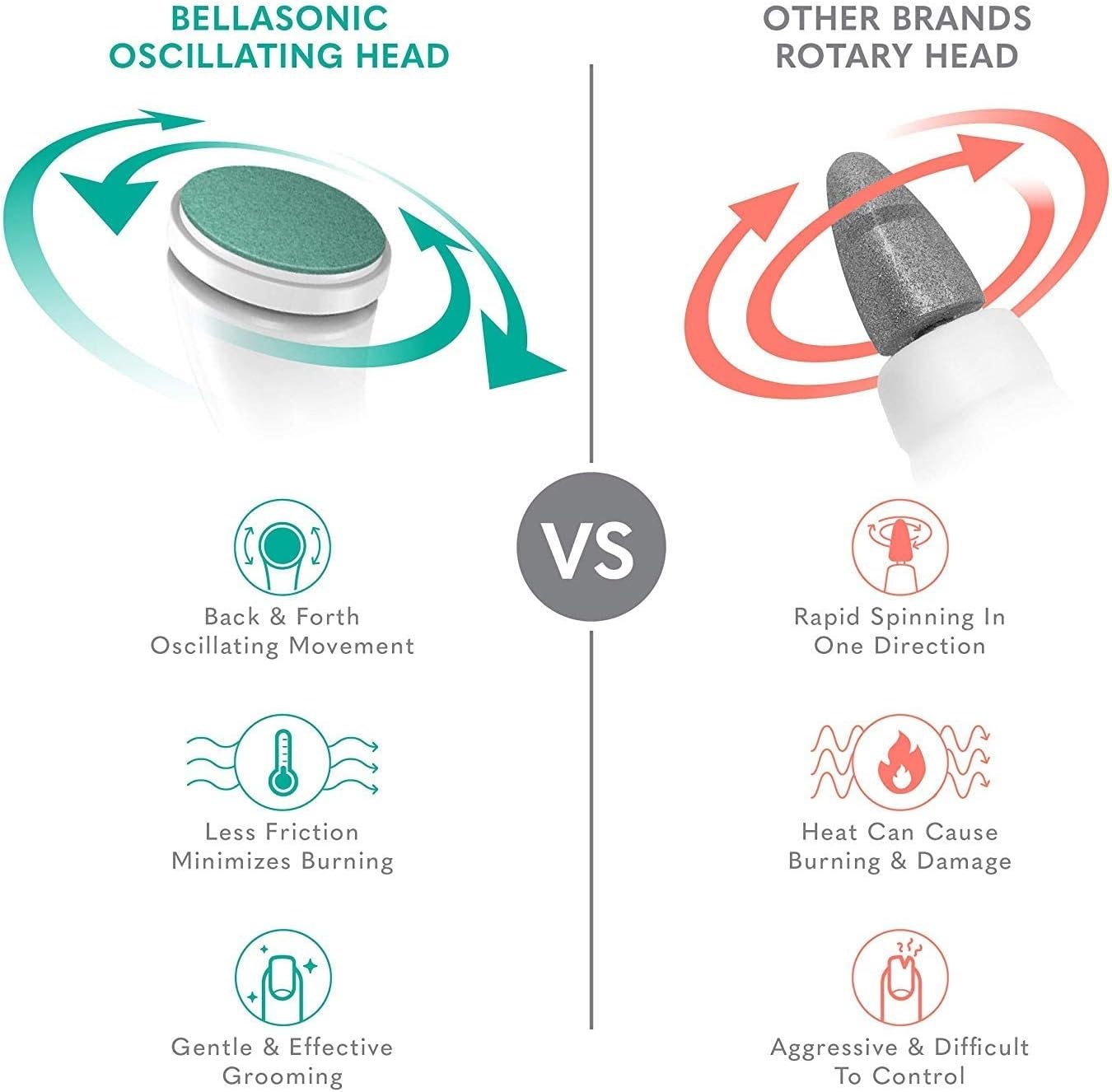 The Bellasonic Advanced Nail Grooming System oscillating head was designed for precise grooming of nails, cuticles and surrounding skin while eliminating the burning sensation caused by traditional spinning nail files. The difference is clear!