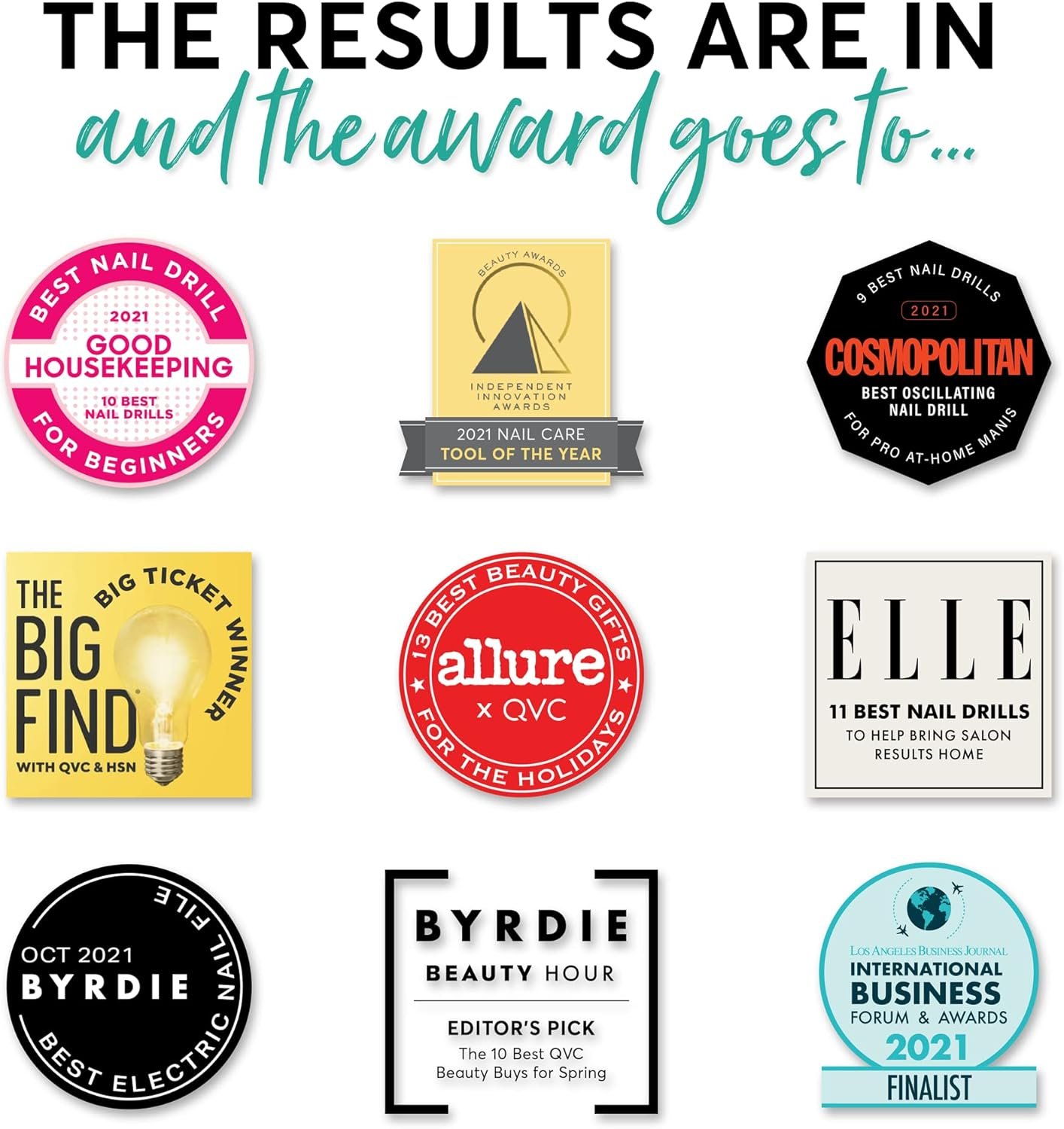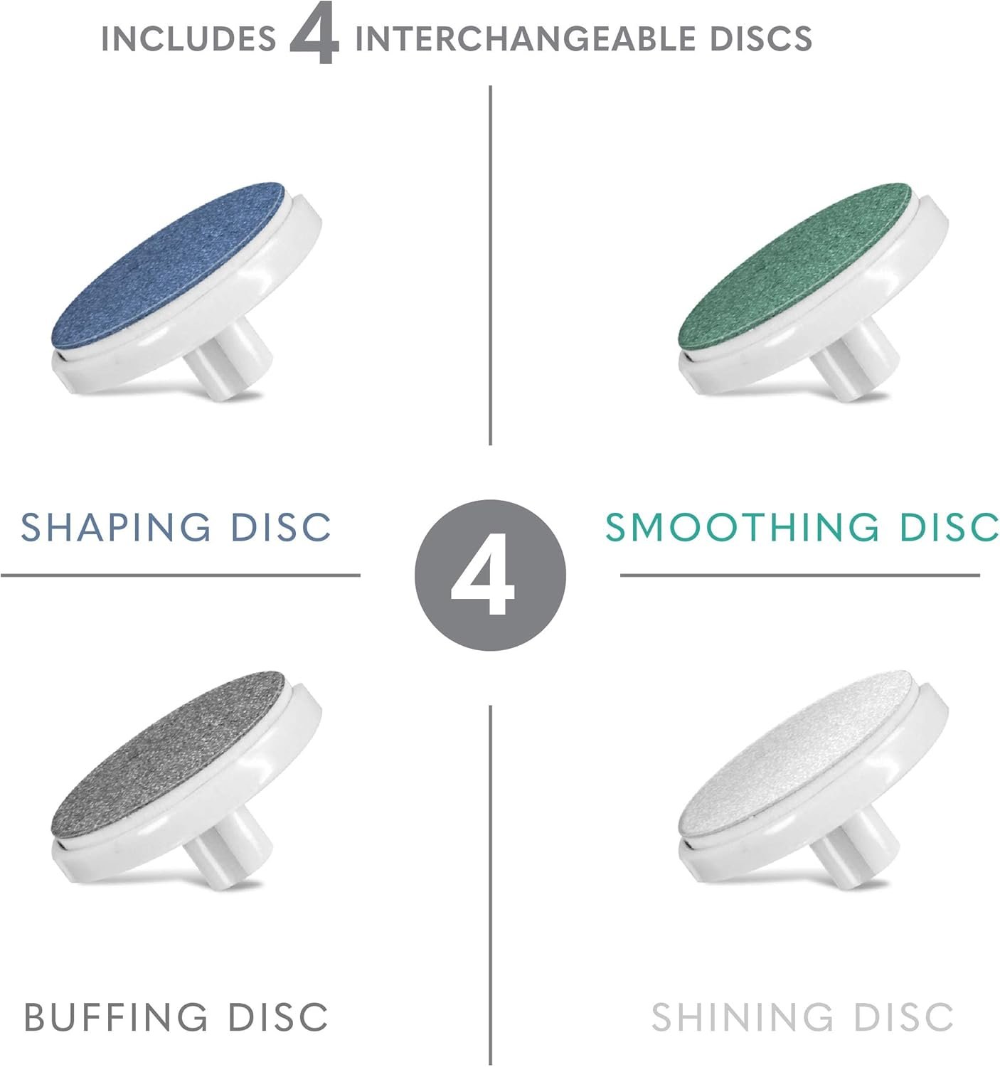 4-in-1 ELECTRIC NAIL FILE with Unique Oscillating Head with 4 Multi-Purpose Discs for Shaping, Smoothing, Buffing & Shining and Storage Cradle. Get Salon Quality manicures and pedicures at home!