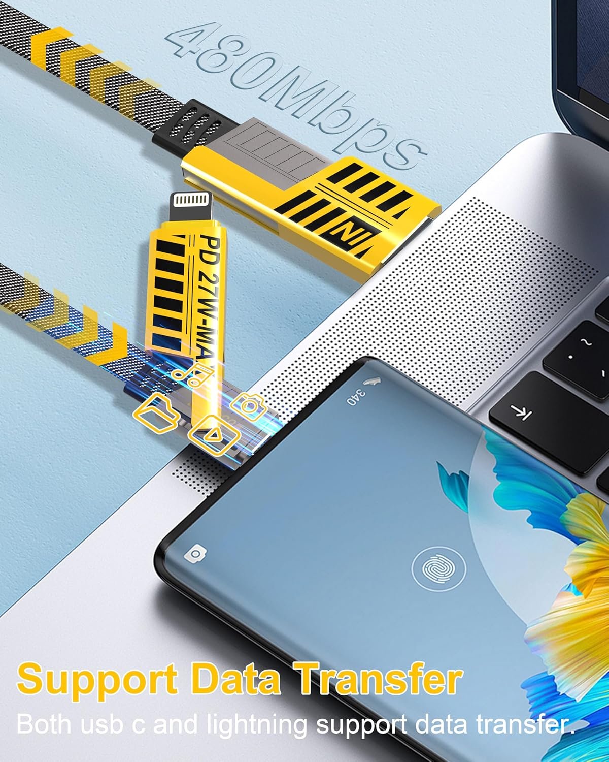 ⚡𝐅𝐚𝐬𝐭 𝐂𝐡𝐚𝐫𝐠𝐢𝐧𝐠 & 𝐃𝐚𝐭𝐚 𝐒𝐲𝐧𝐜⚡ Our apple usb c cable is equipped with 65W fast charging power and apple lightning cable has 27W fast charging, allowing you to get the power required for one day in 35 minutes. At the same time, our usb c and lightning cable supports data syncing, which transmits 480Mbps per second. Transmit large files of 1G just need 25s. Note: To achieve 65w fast charging, please be equipped with a charging adapter of more than 65W