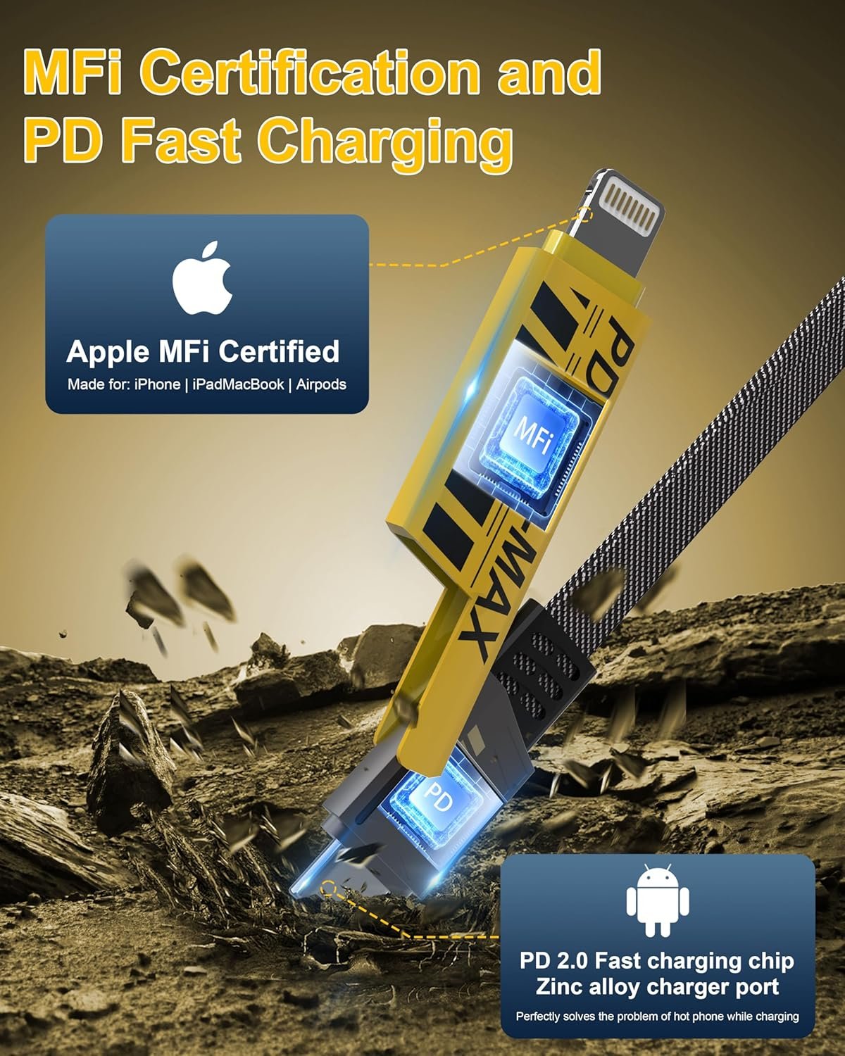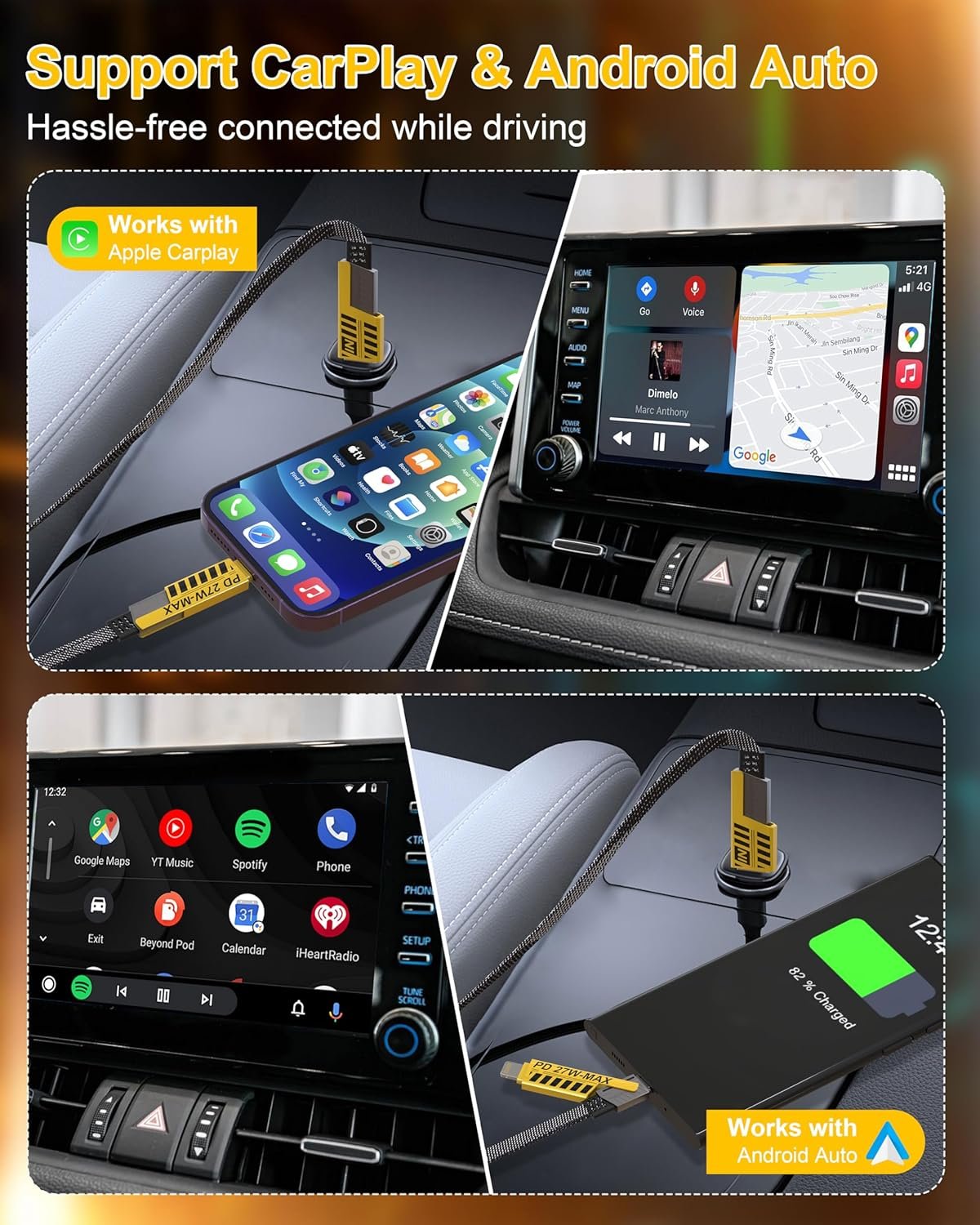 🚗𝐒𝐮𝐩𝐩𝐨𝐫𝐭 𝐀𝐩𝐩𝐥𝐞 𝐂𝐚𝐫𝐩𝐥𝐚𝐲 & 𝐀𝐧𝐝𝐫𝐨𝐢𝐝 𝐀𝐮𝐭𝐨🚗 This 4-in-1 usb c cables and iphone cable can be compatible with Apple’s official CarPlay and Android Auto system. Keeps stably connected during the whole driving journey. But before using CarPlay, please confirm whether your vehicle supports the CarPlay system