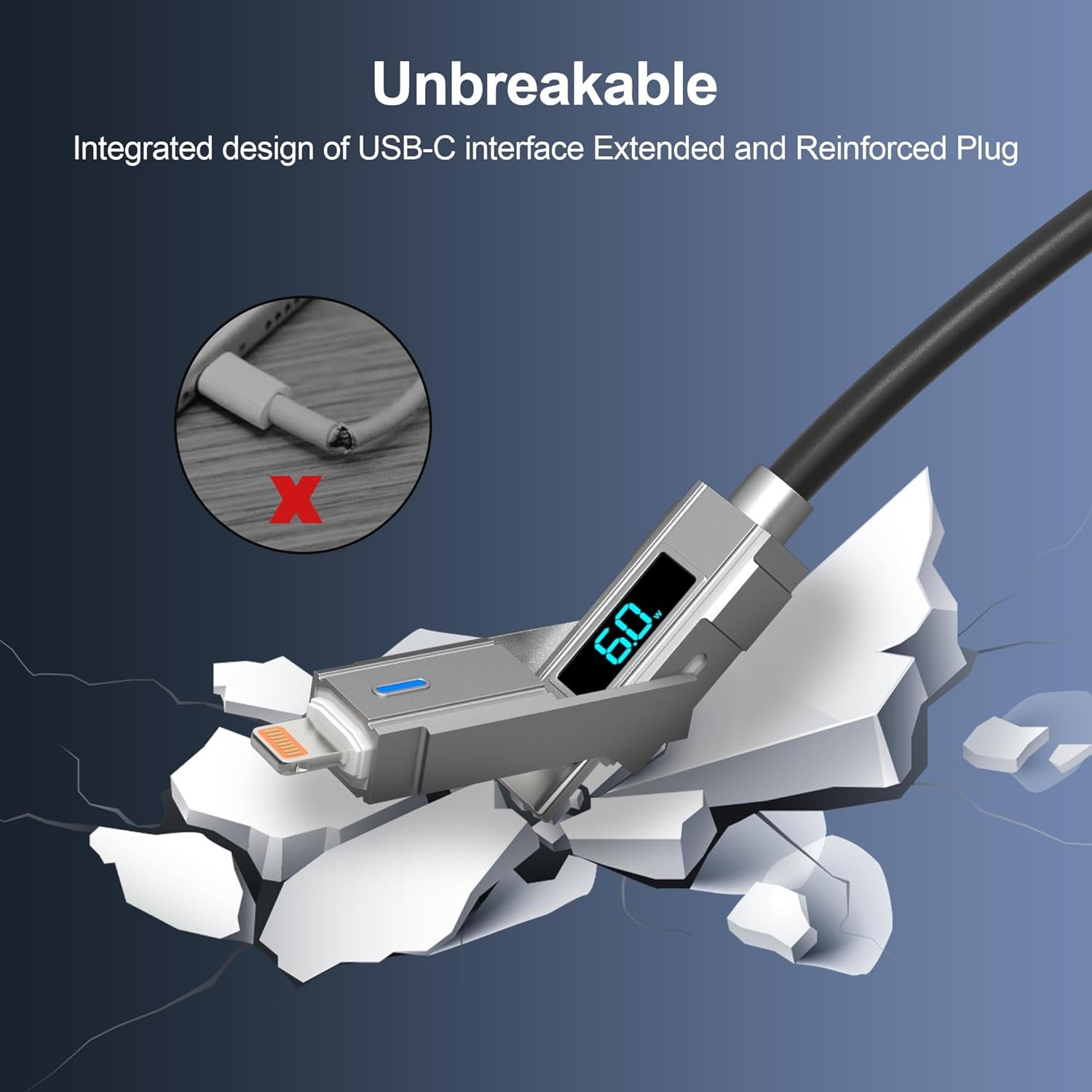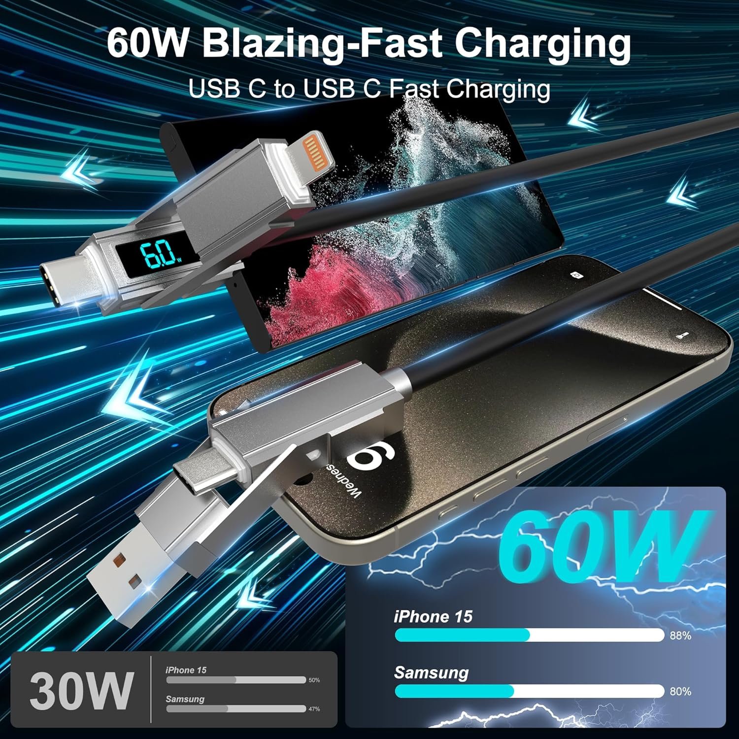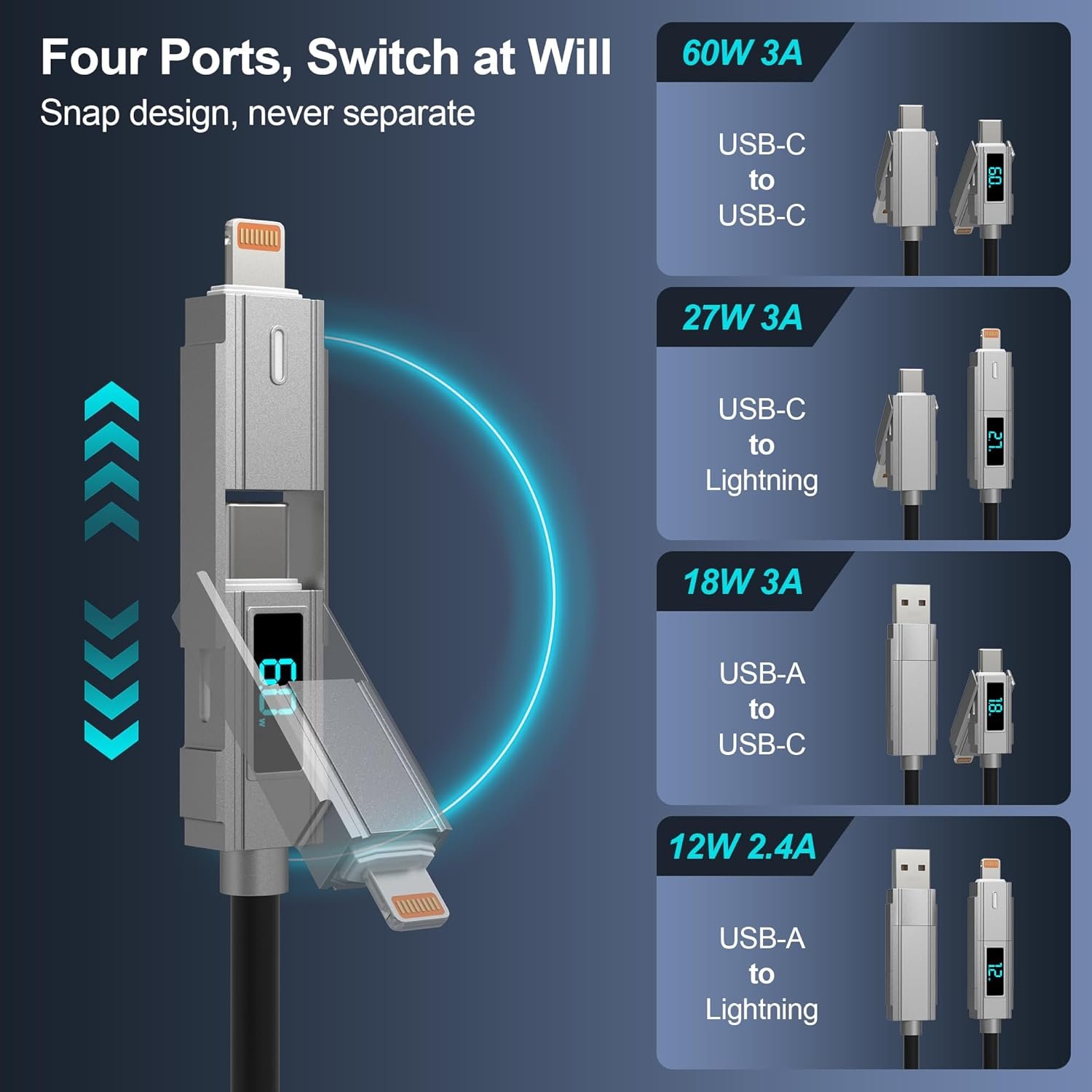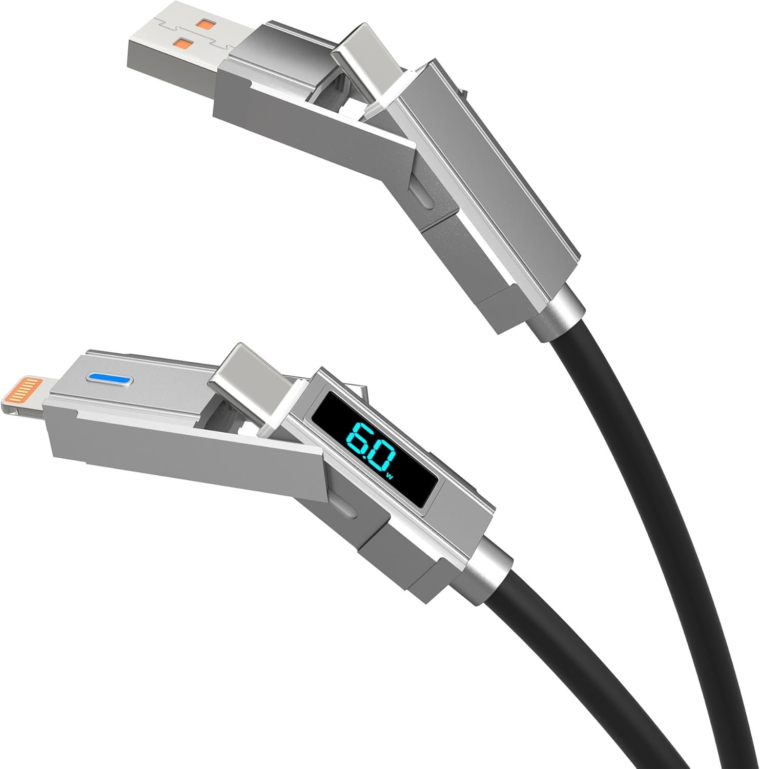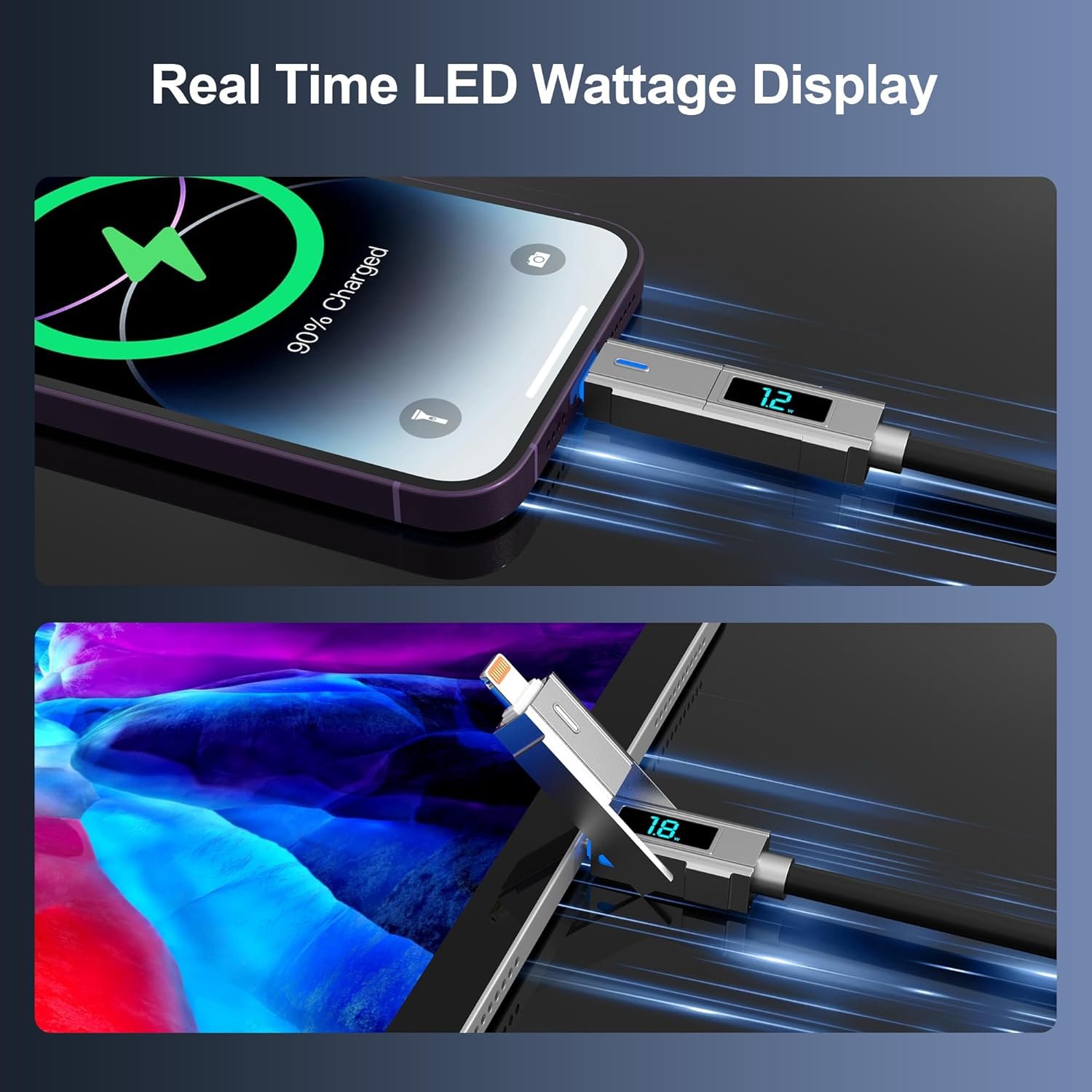 【4-in-1 & LED Display】 The 4-in-1 multi charger cable was designed with the idea of simplifying your life. It combines four ports and LED display into one cable. USB A to USB C, USB A to Lightning, USB C to Lightning, and USB C to USB C. Simplicity and efficiency, no need to carry multiple cables for different devices.