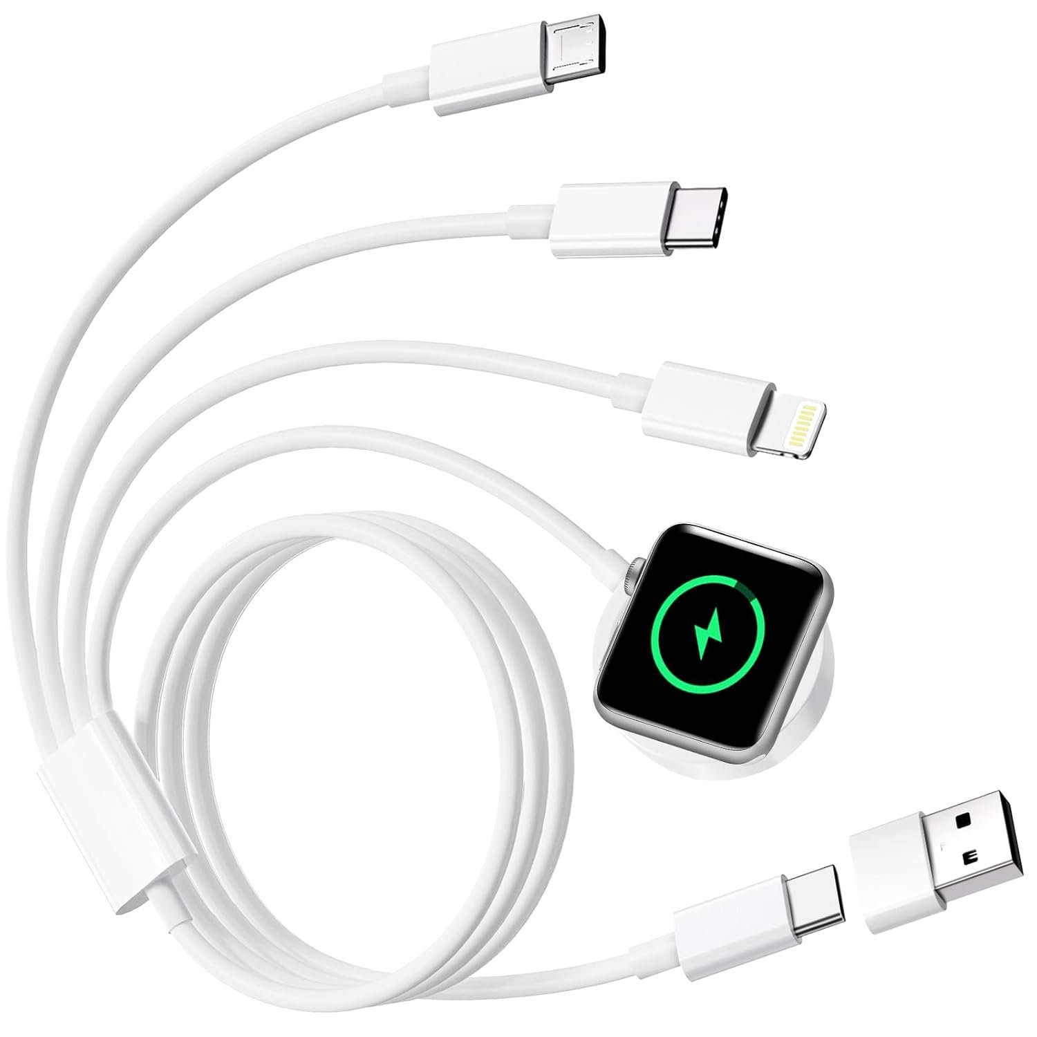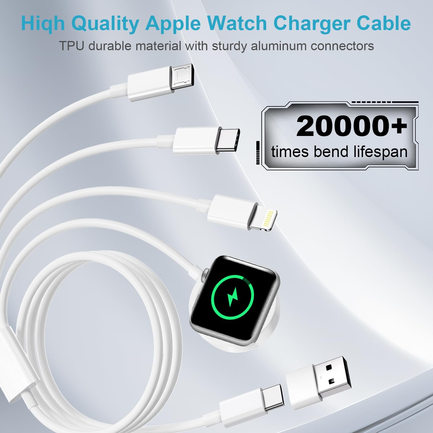 The Apple watch charger cord designed with connectors for Apple, Micro, and Type-C. It can support 4 devices charging at the same time.4 in 1 charging cable is designed for Apple Watches Series, Mobile Phones, and Electronic Devices.