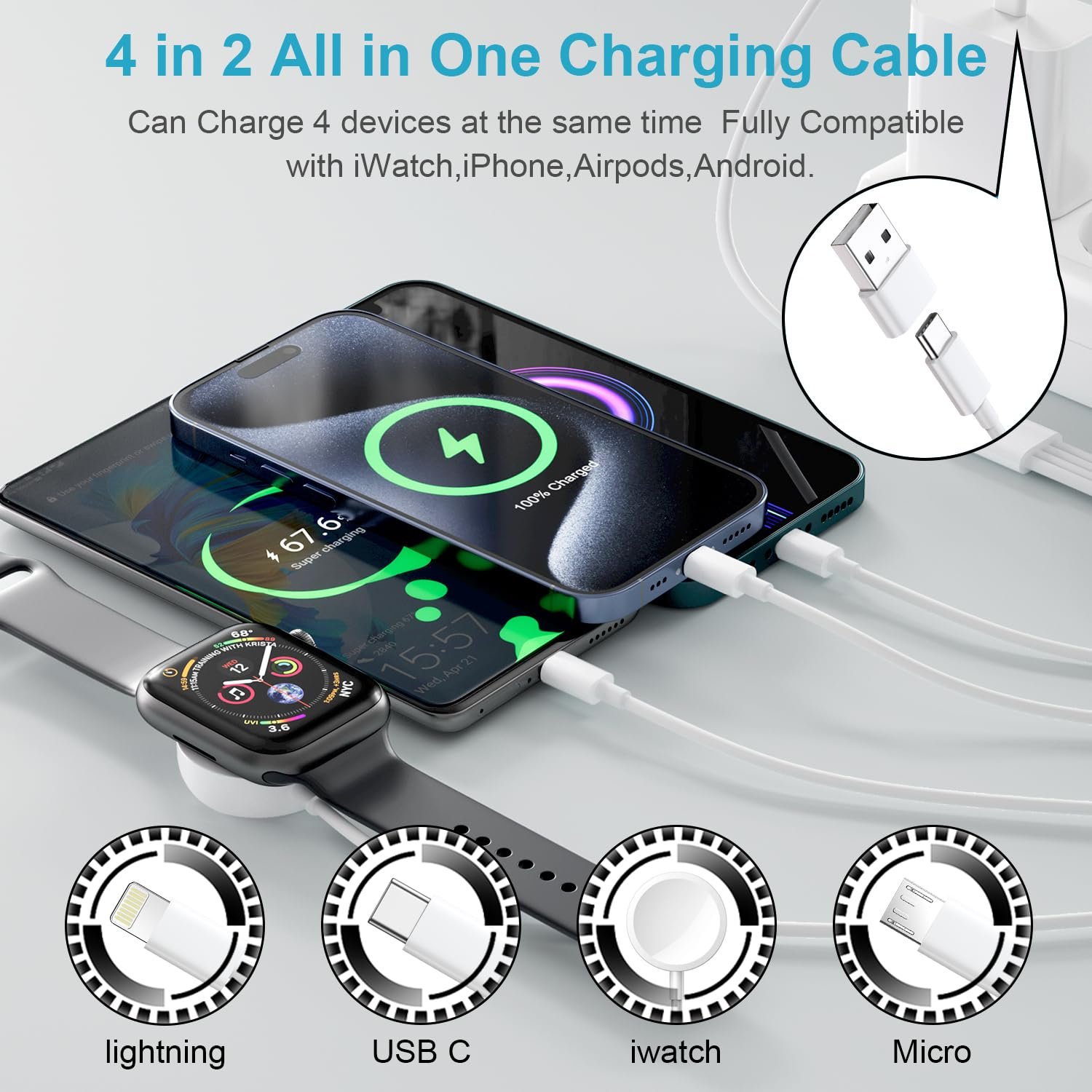 iPhone and Apple Watch Charger Perfect Compatibility: This Apple watch charger USB C is compatible with Apple Watch Series 9/ 8/ 7/ 6/ 5/ 4/ 3/ 2/ SE/ Ultra. iPhone 15/15 Pro/15 Max/15 Pro Max/iPhone14/13/ 12/11 /Pro/Max/XR/XS/XS Max/X/8/8Plus/7/7 Plus/iPad/AirPods, Type-C for Galaxy, LG, Google Pixel, Nexus, Huawei, Lumia, One Plus. Micro USB for most Android phones, Pods, TWS headphones and more.The 4 in 1 multi charging cable compatible with all iPhone and Apple Watch series.