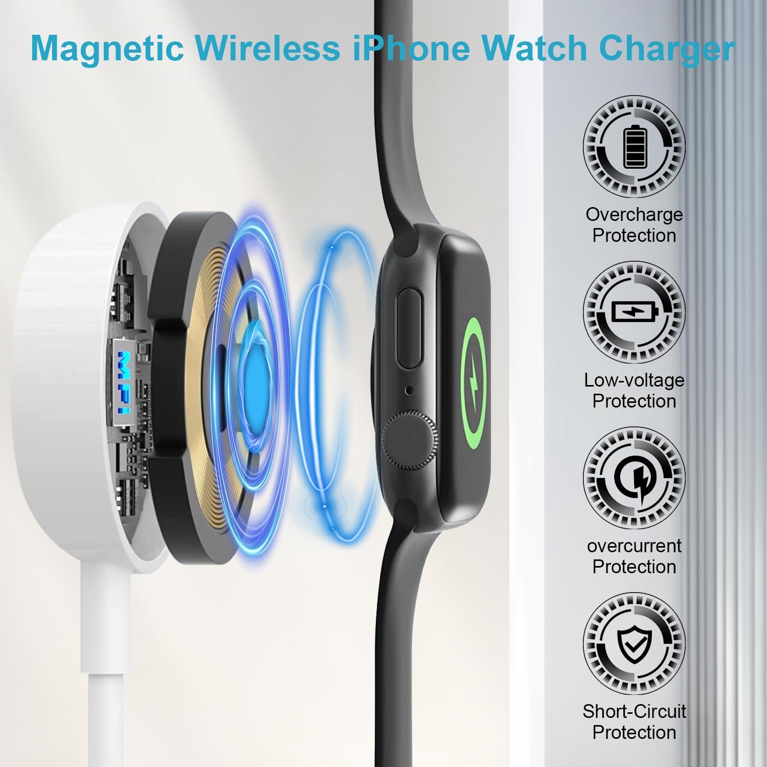 -iPhone and Apple watch charging cable is made of high quality tpe wire, enhance heat dissipation capability, Our iPhone and watch charger cable is more flexible and sturdy. We have tested it to withstand 20000 bends, resulting in a longer lifespan compared to ordinary cables.The charging head of the iwatch charger has been upgraded to be more stable, so that the watch is not easy to fall off and interrupt charging.