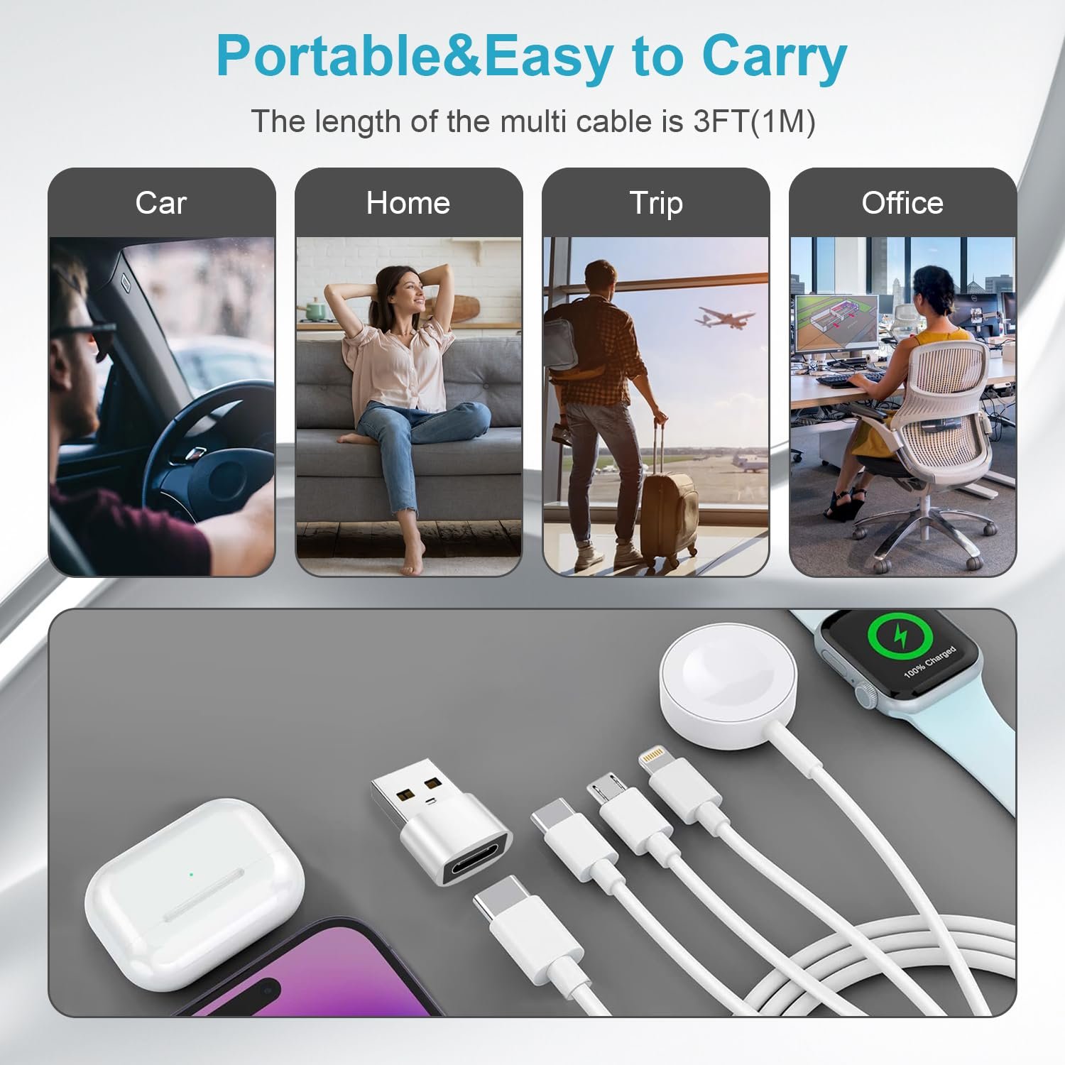 -Travel iPhone&iWatch charger is a portable and compact design for easy take it to anywhere, travel, in the car, in the office, on the go. If you have limited charging sockets or USB ports, the 4 in 1 multi charging cable can help reduce cable clutter and make managing your charging setup easier. Our portable apple watch charger can be a valuable travel companion as it reduces space of your bag.