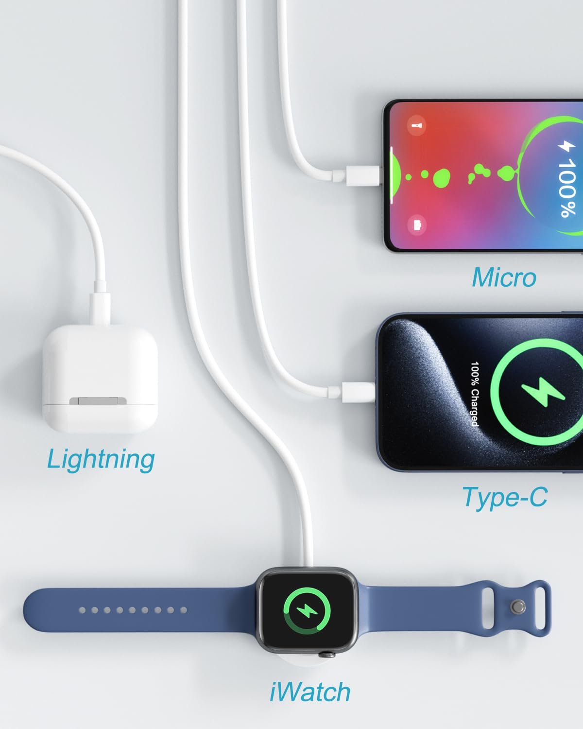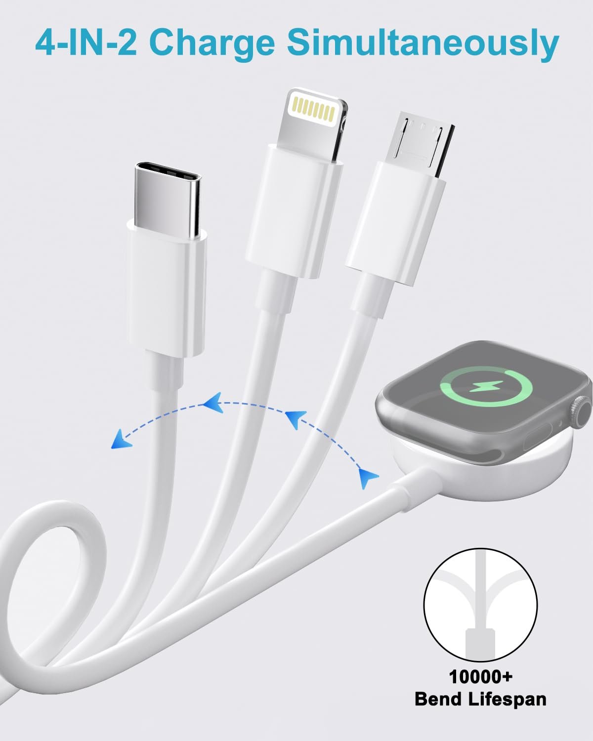 [4 in 2 Multi Charging Cable Universal Compatibility] The iPhone and Apple watch charger is compatible with all iWatch series 9/8/7/6/5/4/3/2/1/Ultra/Ultra 2/SE/SE2; and iPhone/iPad/Airpods Series.Type-C port for Samsung Galaxy/Huawei/iPhone 15 series. Micro USB for most Android phones. It can support 4 devices charging at the same time, this apple watch charger cable make your life convenience. To get better experience, please use Apple original 20W USB C charger Adapter.