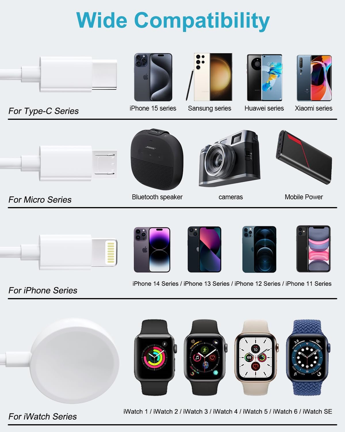 Upgrade travel iPhone multi charger cable can meed all devices in the market and the 3ft length is very suitable in anywhere. You can use it in your bed or safa when charging at home, share it with your backseat friend in the car, Also you can carry the apple watch charger cord in business or travel as the portable and multi design.
