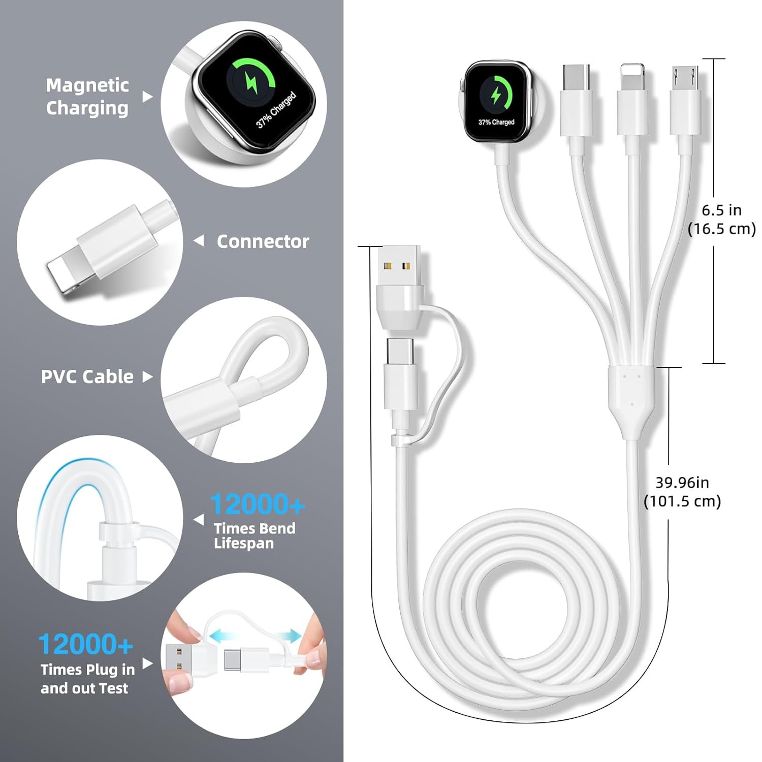 【All in One Charger Cord】Upgraded 4-in-2 USB C watch and i phone charger cable for your watch, i-Pad and Phone. All in one convenient design, you can stimulatously charging 4 devices and enjoy a more efficient lifestyle.