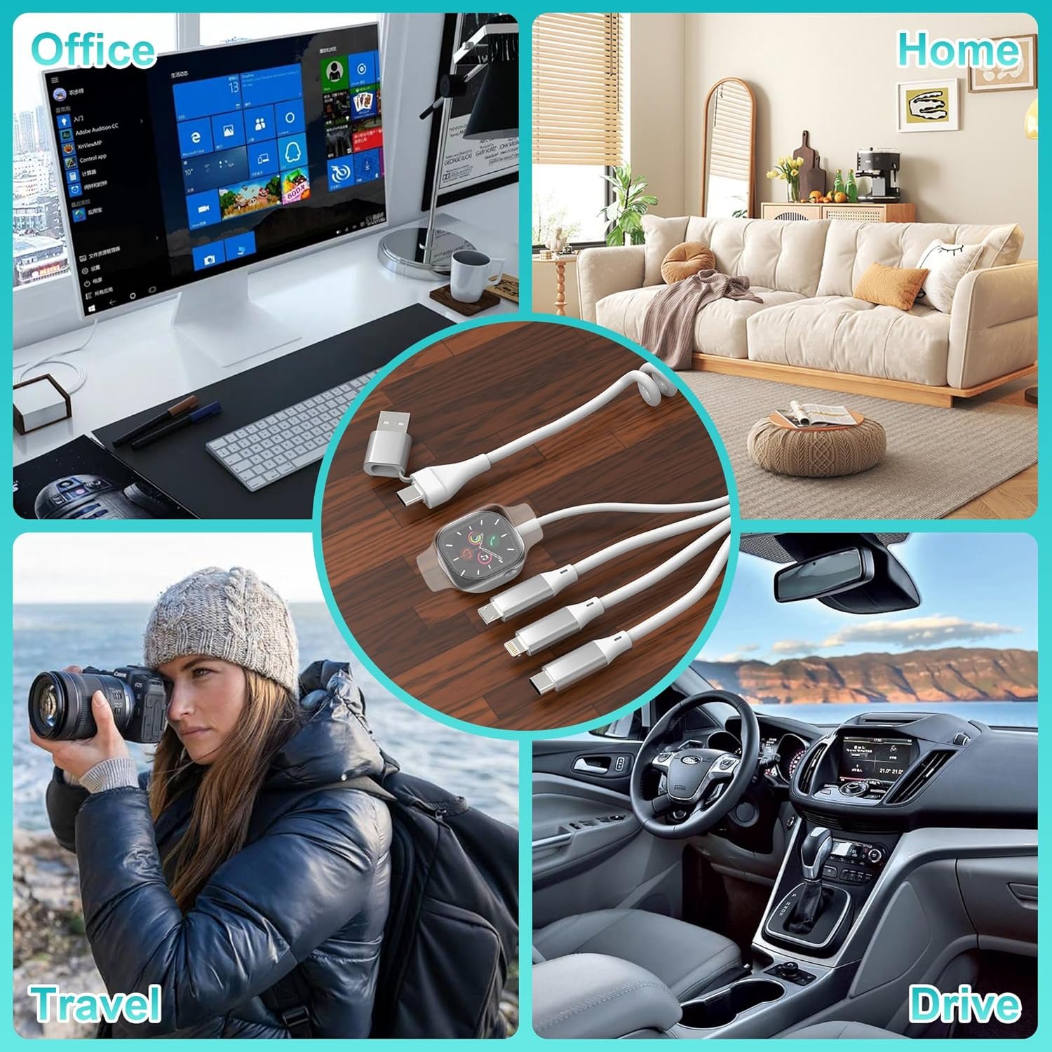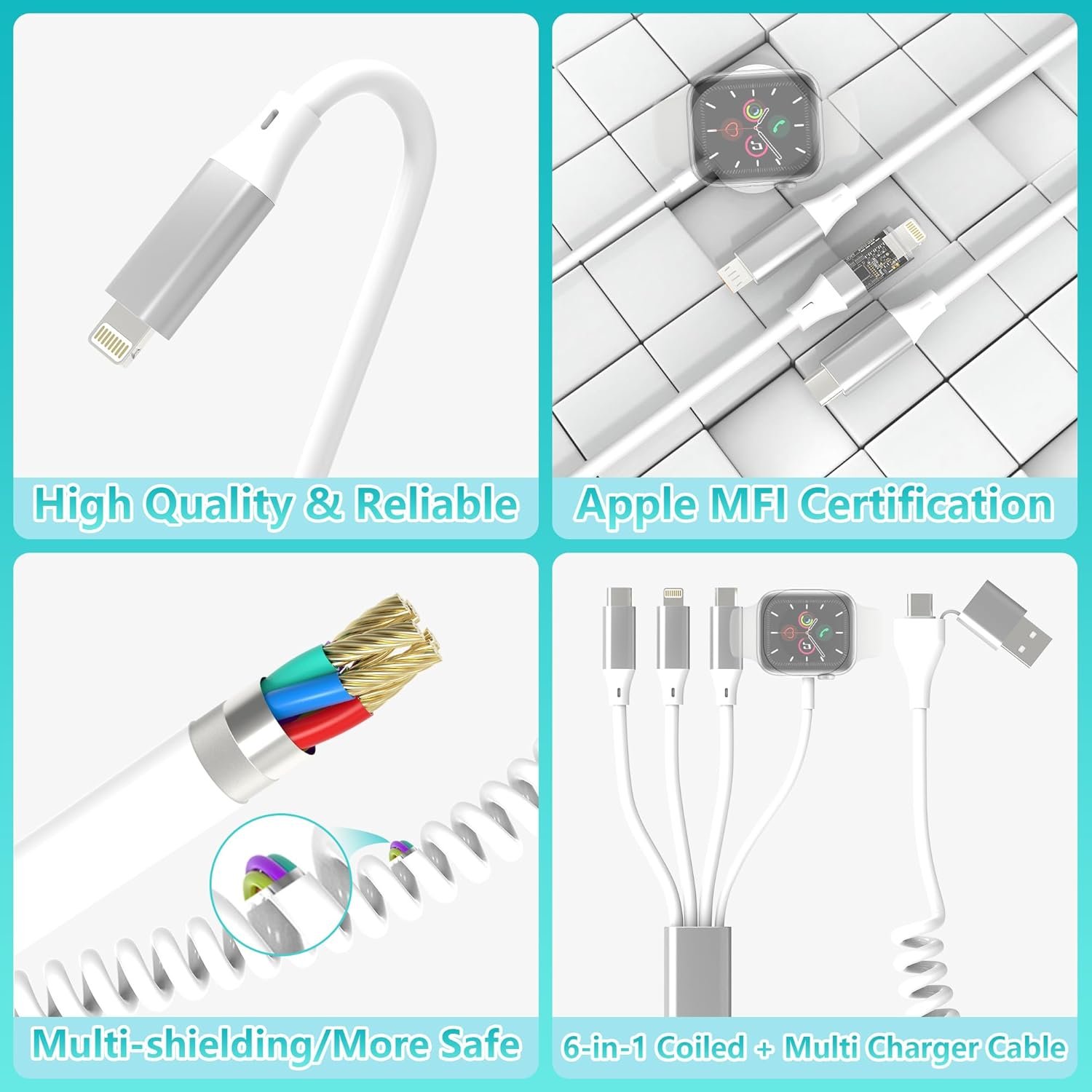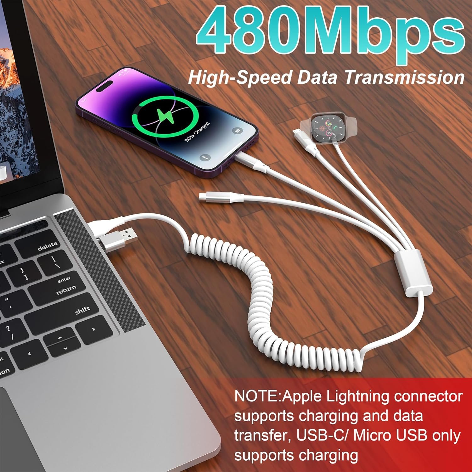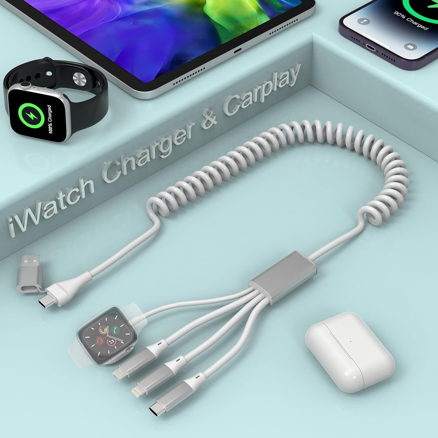 Multi Charger Cord :4 in 2 charging cable with USB A and USB C port and 4 connecters include Lightning/ Type-C/ Micro USB and iWatch charger.Just put the connector close to the back of the watch, and the magnetic attraction will automatically attract the watch.Support to charge four devices at the same time