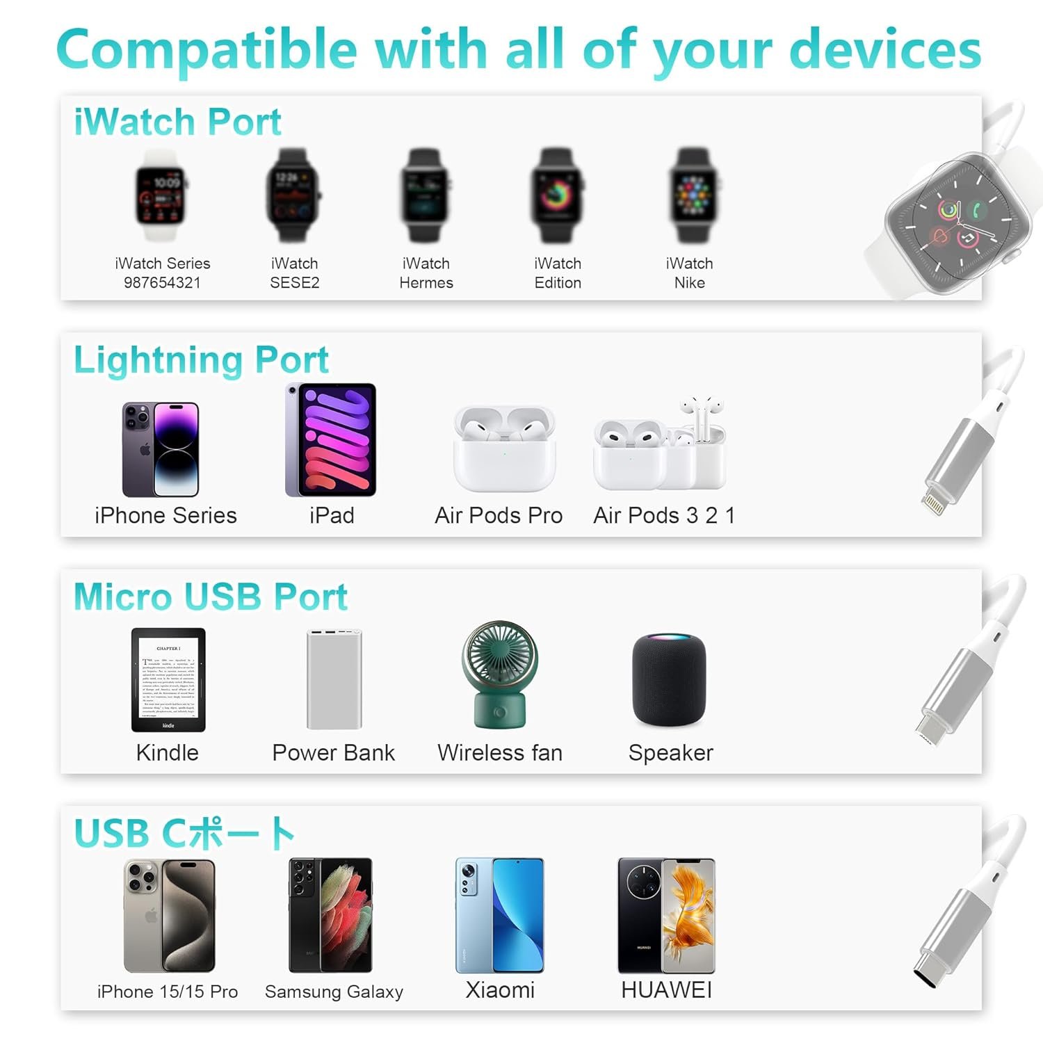 Wide Compatibility : Magnetic iwatch charging port compatible with all apple Watch Series Ultra/10/9/8/SE2/7/6/SE/5/4/3/2/1; Lightning port compatible with iPhone 14/13/12/11/Pro/Max/XR/XS/XS Max/X,Pad 4,Pad Air,Pad mini ect all iOS device;Type-C for iPhone 15/16,Samsung Galaxy,Google Pixel,Google,Huawei,most Android phones; Micro USB for most Android phones,Kindle,Bluetooth headset and more( ▶▶Type C port is not suitable for iPad/tablet/MacBook, it will not charge when plugged in)