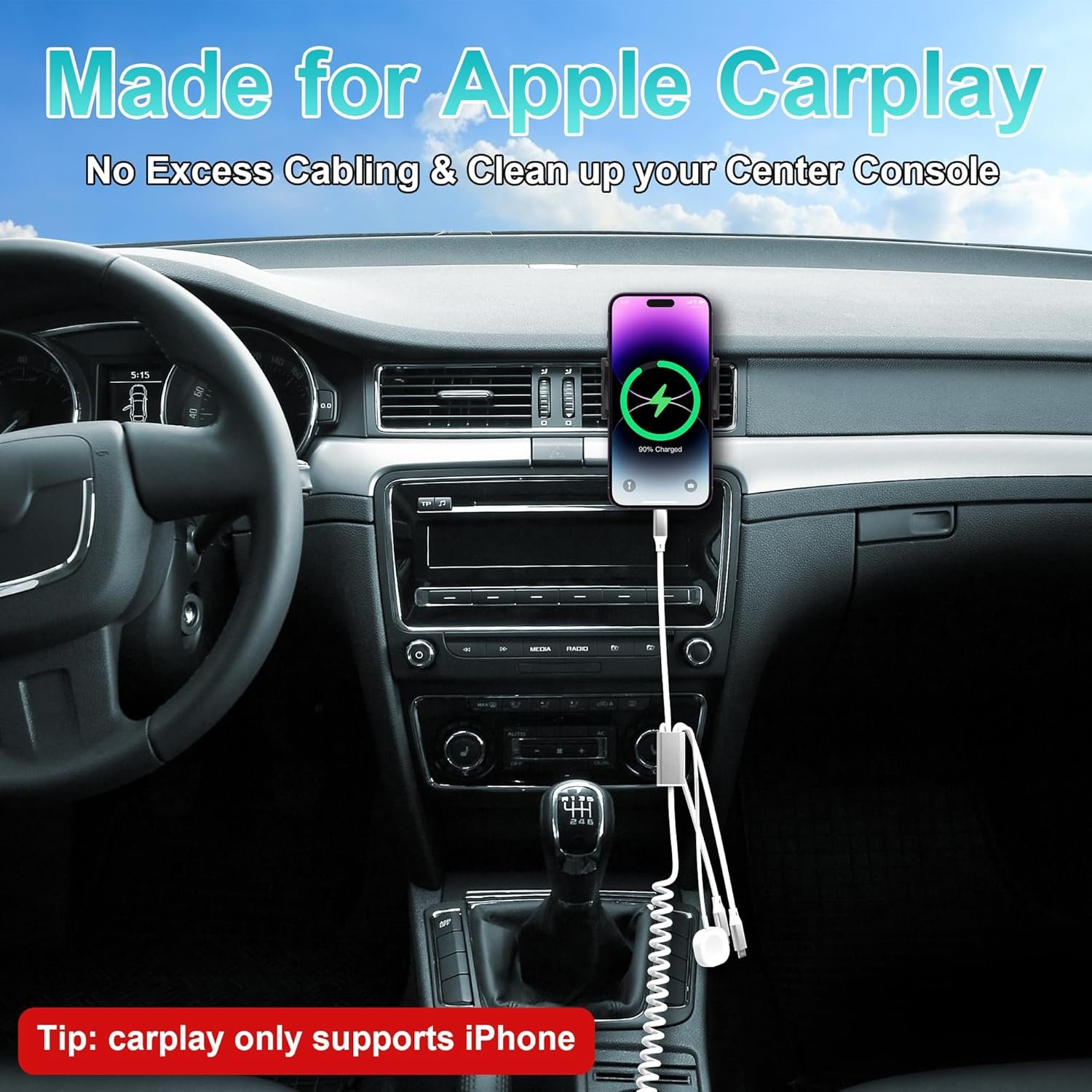 MFi Certified iPhone Carplay Cable : The coiled iphone charger cable can be used to charge your iPhone in the car and supports Apple carplay(Doesn’t work with Android auto!).MFi certified, use the original chip, no error pop-up window when charging